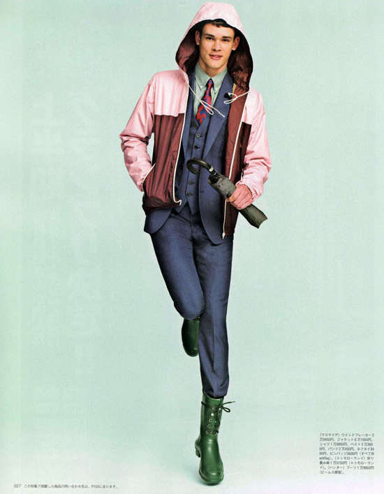 Daniel Evans, Douglas Neitzke and Doug Jewell are all smiles for the festive editorial from Japanese magazine Popeye. Photographed by Junji Hata and styled by Tomoki Sukezane, the cheery colorful editorial makes light of damp weather.