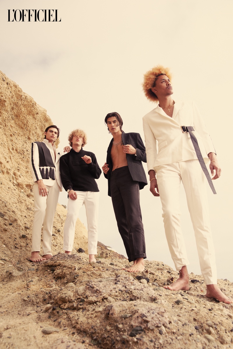 L’Officiel Hommes Brasil sets the tone for fall with soft tailoring and natural hues. Sid Rane’s warm, sun-kissed images capture the season’s allure. On a beach outing with Jesse, Christian, Aaron, and Michael, Rane captures each of them in their best light. The models’ style and charisma further elevate elegant suits from brands such as Stile Latino.
