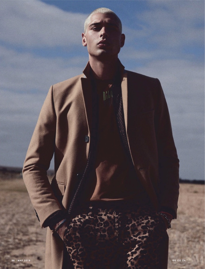 Evan Leff tackles off-duty style for the pages of GQ South Africa. Venturing outdoors, Evan connects with photographer Luke Kuisis. Curating a wardrobe of trendy fashions, Mira Leibowitz styles the story. Looks come together with brands such as Versace, Emporio Armani, and Gucci. Adapting to various aesthetics, Evan wears everything from denim and trim tailoring to graphic knitwear.