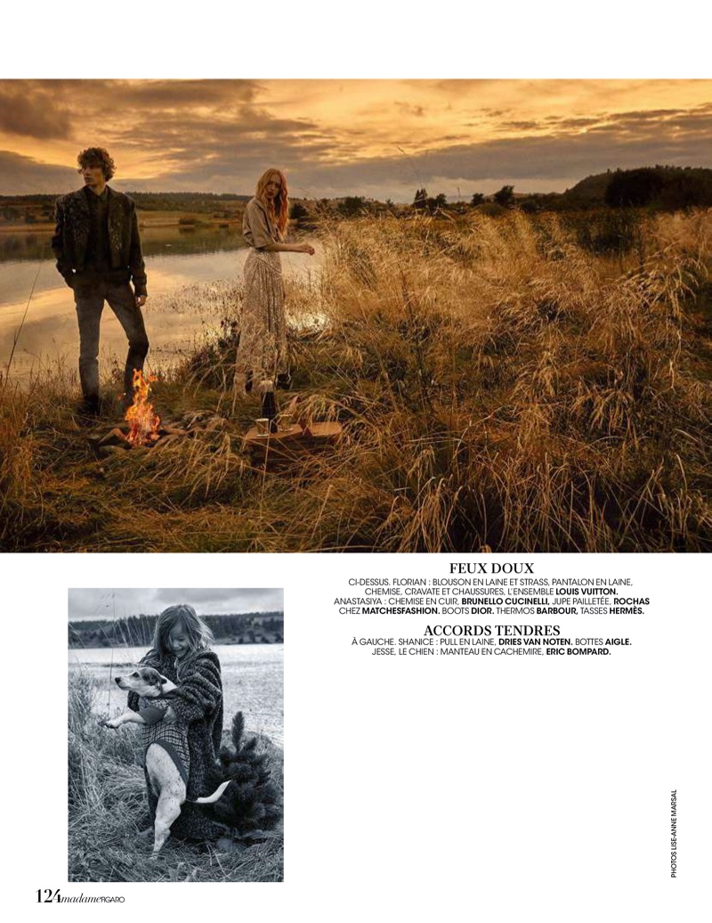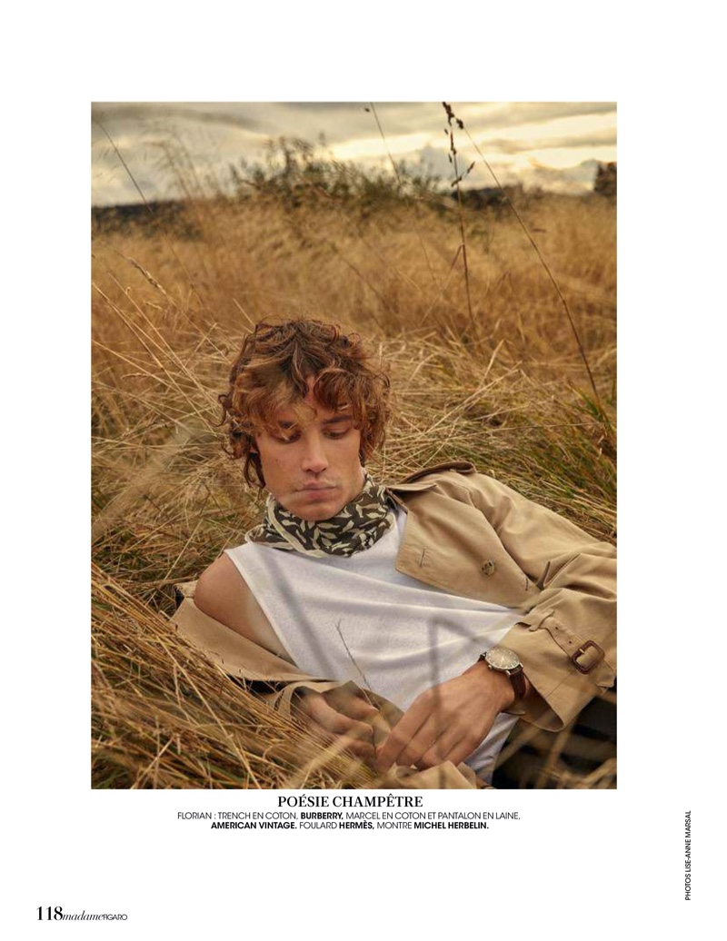 Florian DesBiendras charms in chic fashions for an editorial featured in the December issue of Madame Figaro. Lise-Anne Marsal photographs Florian alongside Anastasiya Gurova. Entitled “Noël Féerie Sauvage,” the story features festive holiday glamour. Sylvie Clemente outfits Florian and Anastasiya in smart and elegant looks for the season. Marsal captures a day with the models as they don a stunning designer wardrobe and blend into the landscape. Clemente features menswear from brands such as Burberry, Hermès, Fendi, and Dries Van Noten.