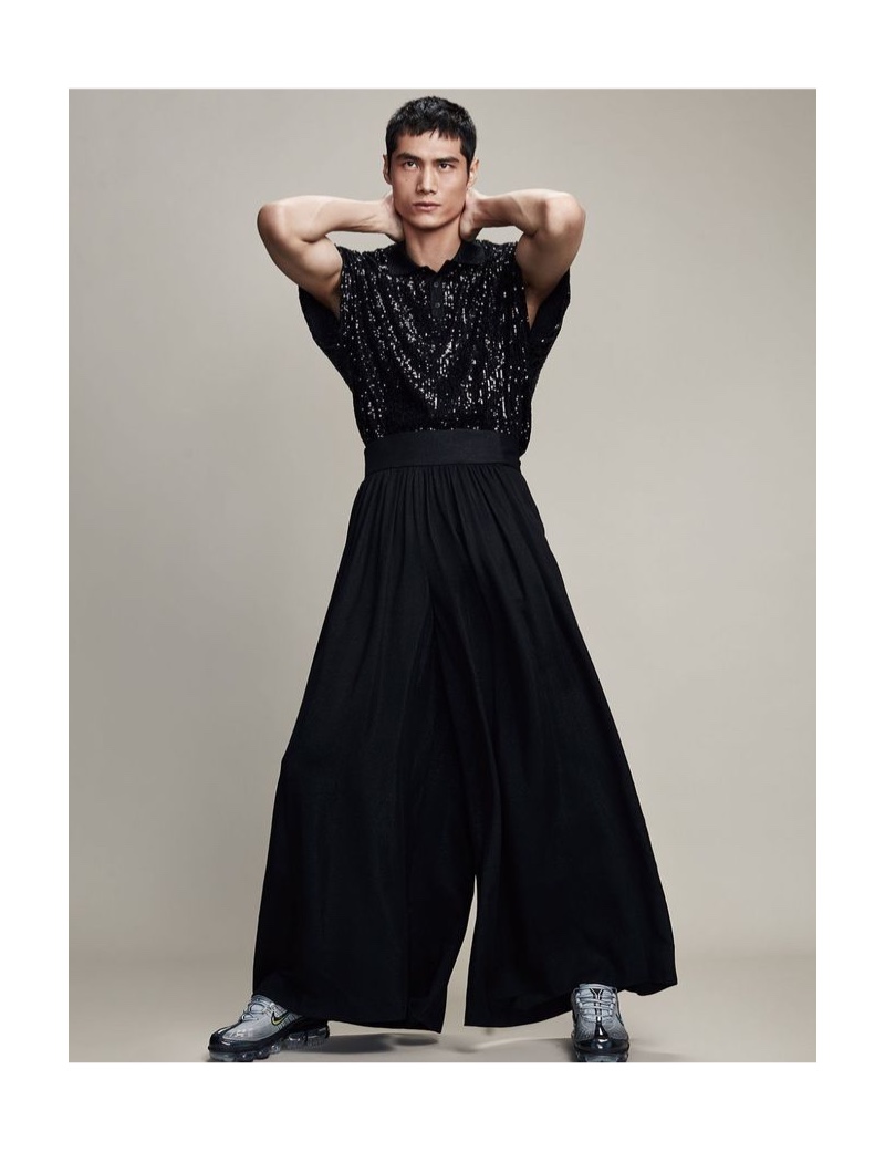 Hao Yun Xiang makes a case for gender-bending style as he takes to the pages of Vogue Me China. He appears in the magazine’s February 2020 issue. Hengyi Liang photographs the leading model, while styling is left to Austin Wang. Statement spring style is front and center for the fashion shoot. Warming up to eclectic looks that mimic the silhouettes of dresses and skirts, Hao dons luxury labels such as Thom Browne and Prada.
