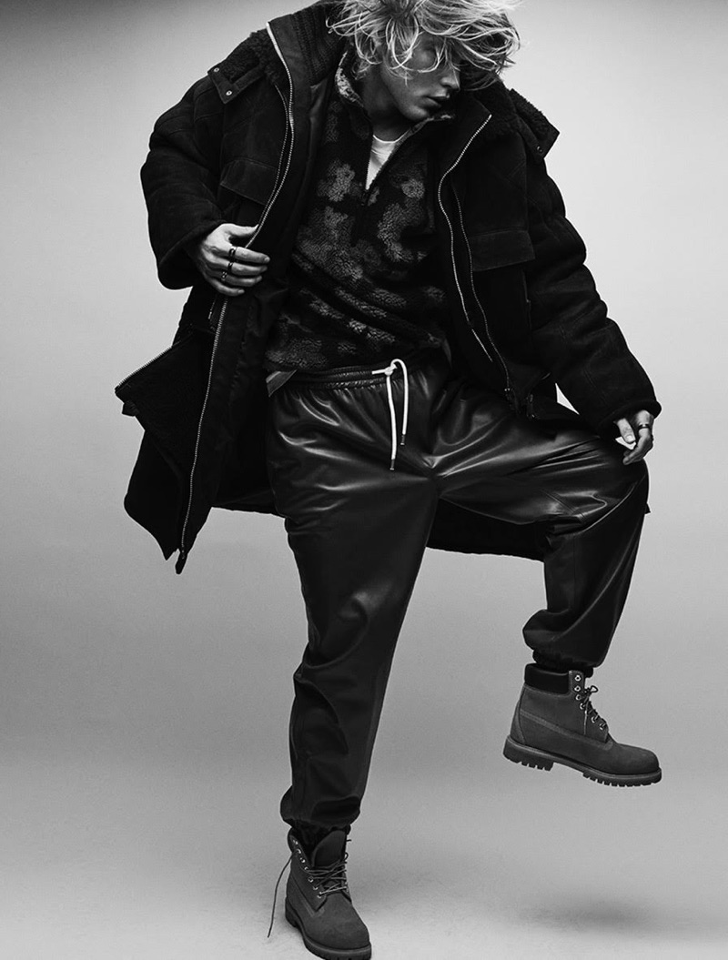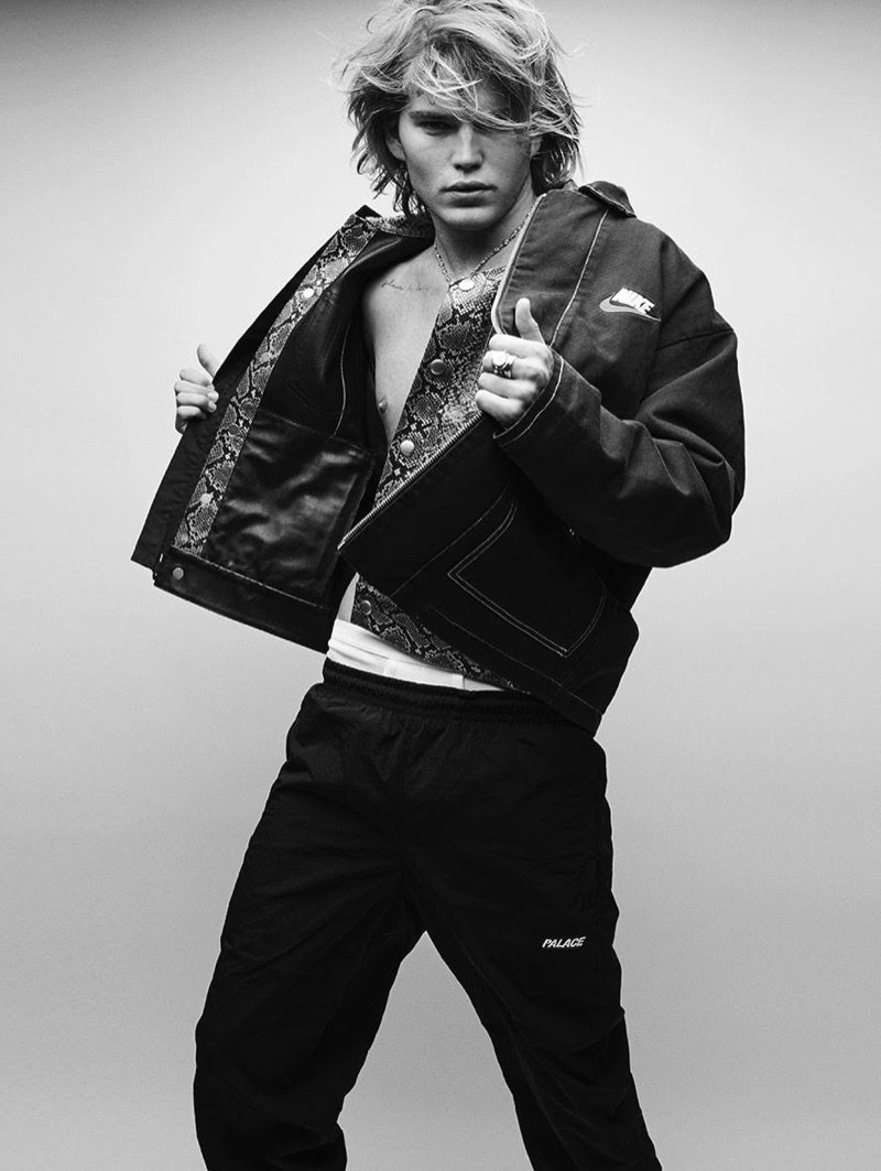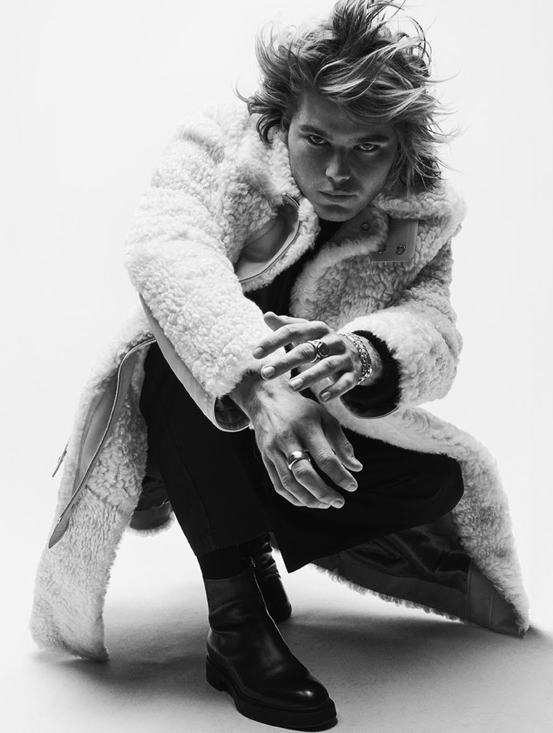 Jordan Barrett stars in a black and white story for Lui magazine. Fred Meylan photographs the Australian model in a streetwear-inspired editorial. The top model takes to the studio in a wardrobe styled by Dan Sablon. Oversized silhouettes are front and center for the occasion. Sporting an eclectic lineup of brands, Jordan wears labels such as Nike, Prada, and Stone Island.