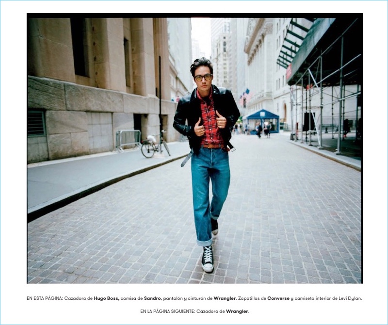 Levi Dylan sports an essential denim jacket as he covers L’Officiel Hommes España. Connecting with the magazine for a relaxed outing, Levi embraces effortless style. It’s here that Álvaro de Juan styles him in brands like Hugo Boss, Wrangler, and Sandro. Appearing before the lens of photographer Amar Daved, Levi’s wardrobe includes straight-cut denim jeans, leather jackets, graphic tees, and more.