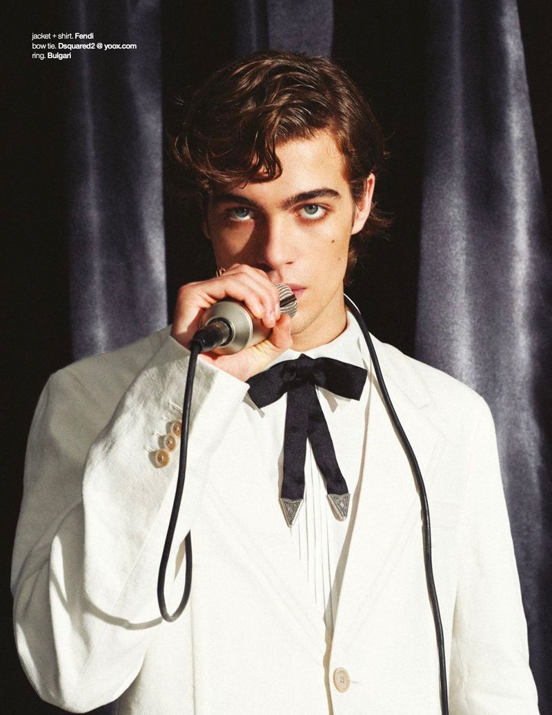 Exuding the charisma of a dynamic entertainer, Lorenzo shines in luxurious numbers. Luca Falcioni styles Lorenzo in fantastic pieces from various labels, including Moschino, Alexander McQueen, and Etro. Meanwhile, Pavlos offers the contrast of on-stage and private personas with images that take us from a minimal studio set to a curtained stage.