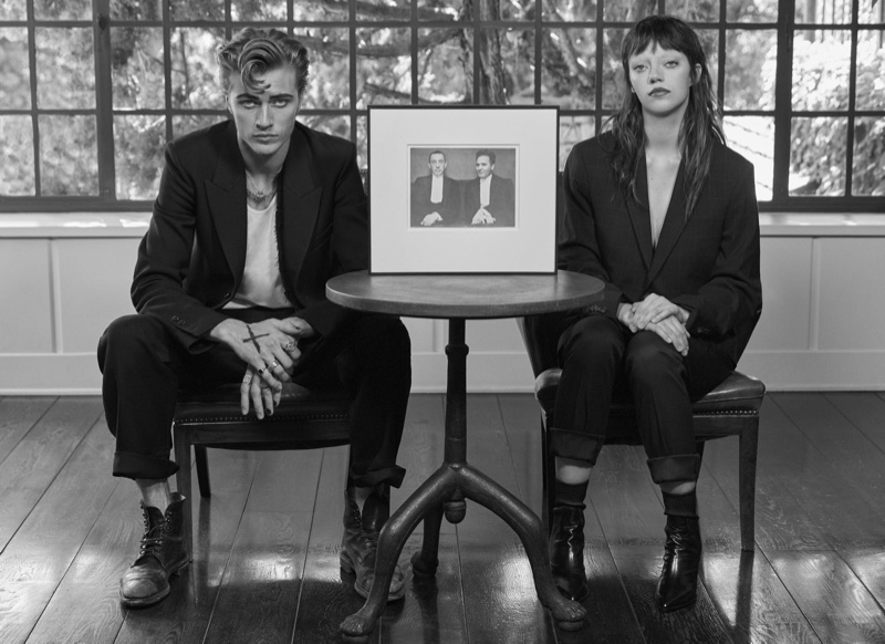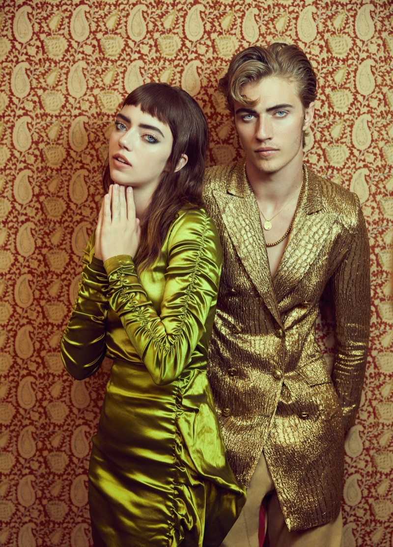 Lucky Blue Smith is photographed alongside his sister Pyper America for the latest cover story from L’Officiel Brasil. The siblings make a bold and glam statement as they don current styles for the magazine’s glossy pages. Embracing vintage-inspired fashions, Lucky dons his signature pompadour hairstyle. Charming with a retro allure, Lucky wears looks that feature brands like Todd Snyder, Sunspel, and Bally.