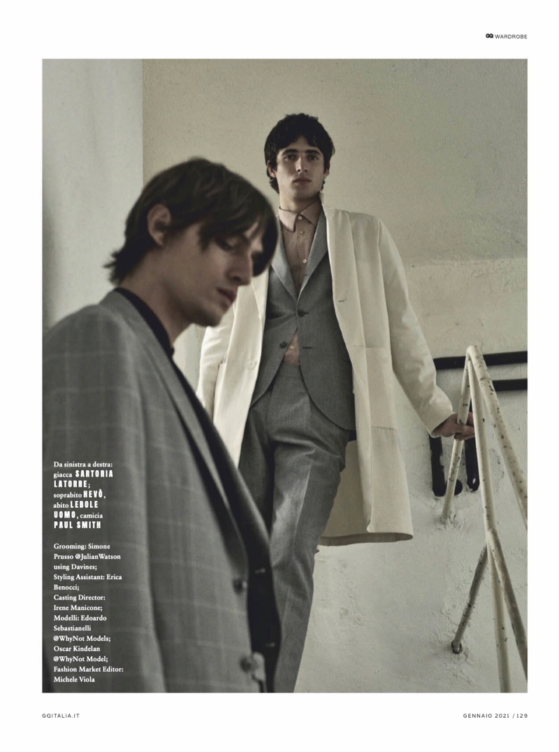 GQ Italia tackles “Sartorial Codes” for its January 2021 issue. The men’s fashion magazine enlists photographer Pablo Arroyo to capture an elegant outing that features models Oscar Kindelan and Edoardo Sebastianelli. Connecting with the pair, Arroyo frames the story with his signature somber tones. Meanwhile, stylist Nicolo Andreoni outfits Oscar and Edoardo in classic tailoring from the spring-summer collections. From check suits to smart separates, brands of note range from Sandro and Brunello Cucinelli to Corneliani.