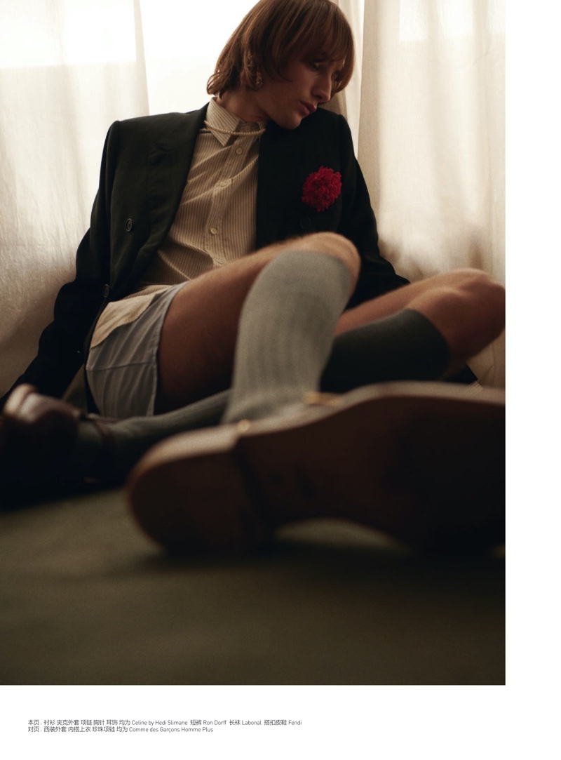 Thomas Riguelle plays dress up for the spring-summer 2020 edition of GQ Style China. Stylist Yuan Qian pulls together a designer wardrobe that clashes with a fun juxtaposition of jewelry. Meanwhile, photographer Antoni Ciufo captures the stylish antics. Taking to his bedroom, Thomas inspires in several looks. He wears various fashion brands such as Raf Simons, Hermès, and Dries Van Noten.