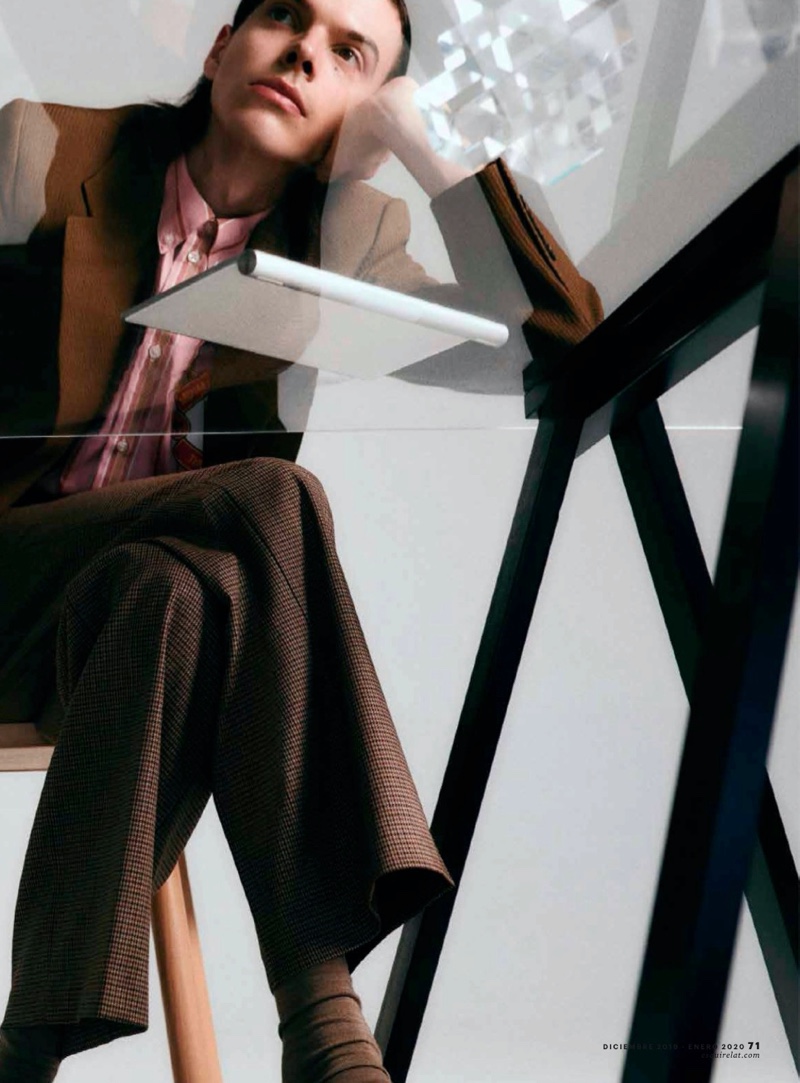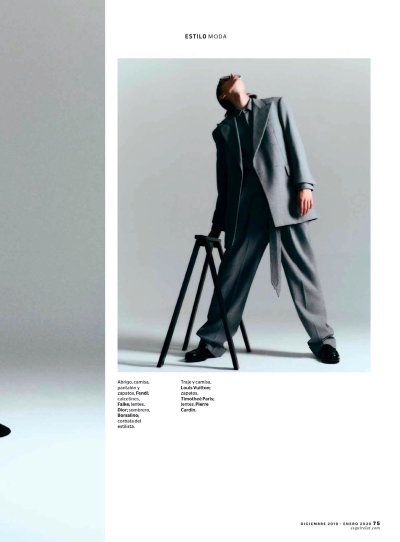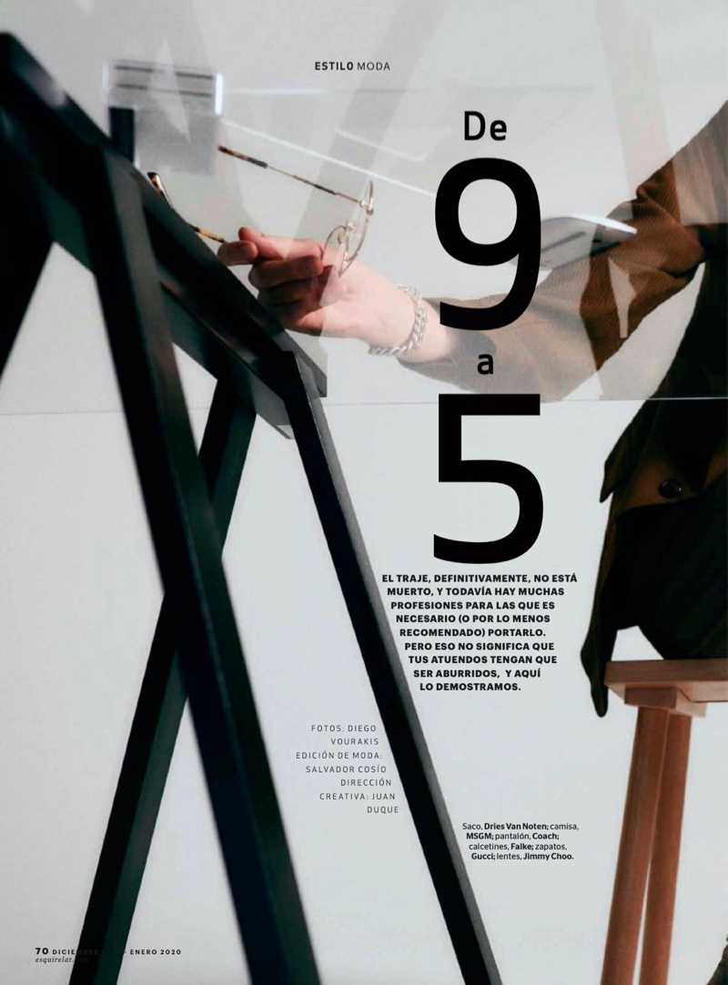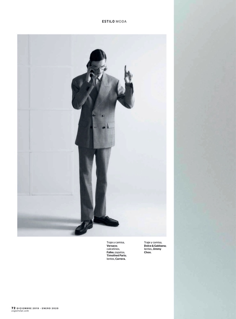 William Valente clocks in for a new editorial from Esquire México. Exploring dapper tailored numbers, stylist Salvador Cosio serves up a strong sartorial narrative. Busy at work, William appears before the lens of photographer Diego Vourakis. Donning slicked back hair and oversized glasses, William inspires in fashions from brands such as Dolce & Gabbana, Versace, and Louis Vuitton.