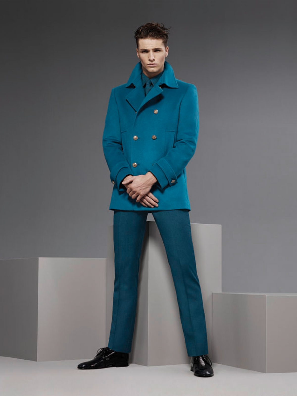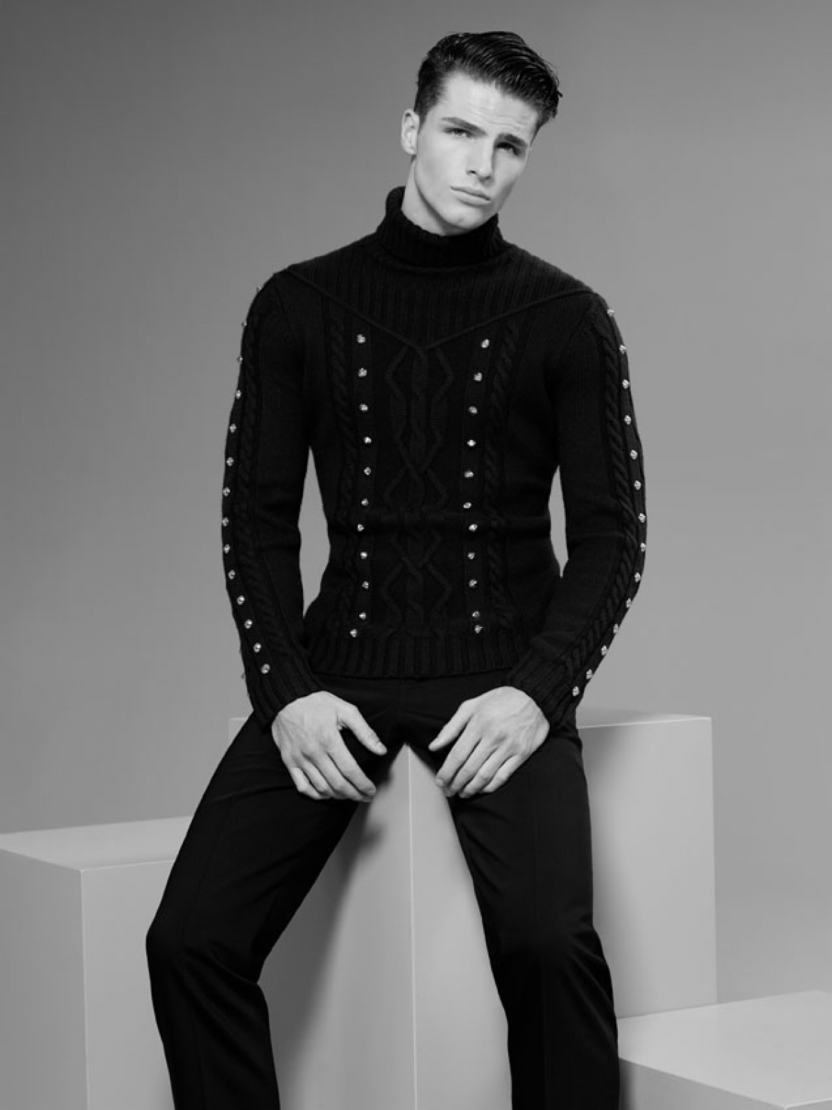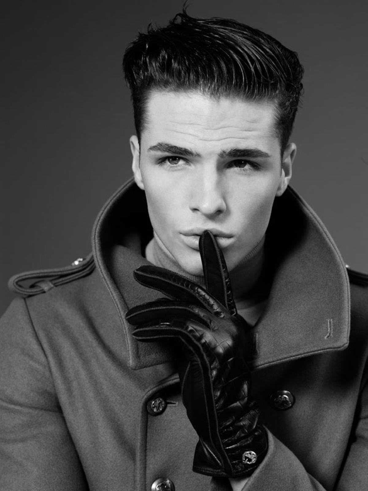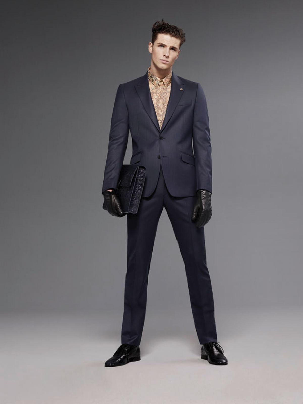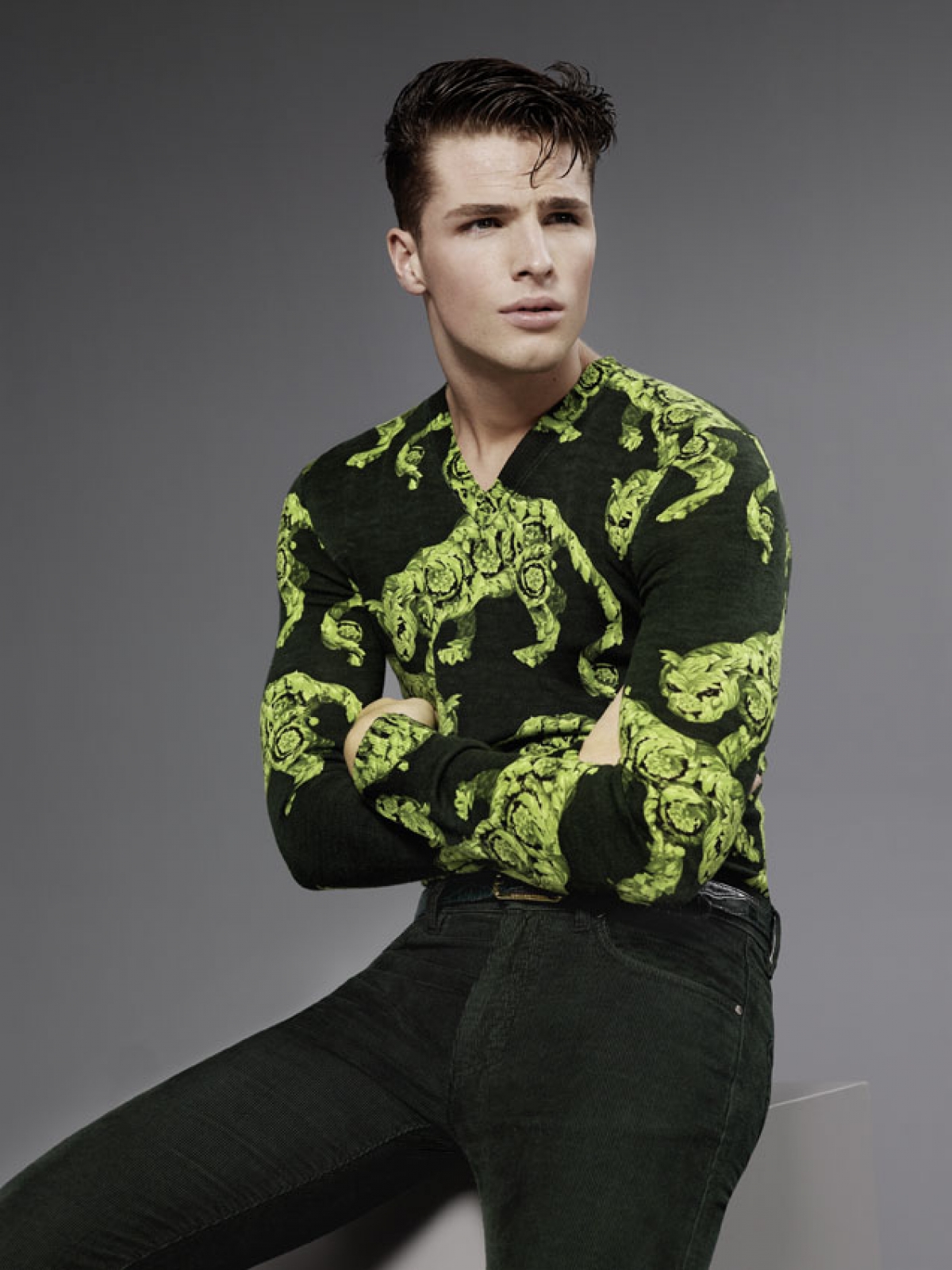 Uniform Mode–After fronting Versace’s spring/summer 2013 mythological campaign, British model Edward Wilding reunites with the Italian label to appear in Versace Collection’s fall/winter 2013 lookbook. Dressed to impress in perfectly structured designs, the Manchester-born model easily alternate military inspired designs, business oriented styles and eccentric numbers. Captured in a series of structured coats, inspired by a severe military aesthetic, or wearing perfectly tailored suits, Edward unveils a multifaceted collection, with a great potential to capture different customers. From the sophisticated businessman who loves exclusive suits, to the bizarre artist who prefers to wear fur jackets and sparkling fabrics, to the habitual Versace client, who loves great fashion, flawless proportions, opulent prints, and Versace’s innate sex appeal.
