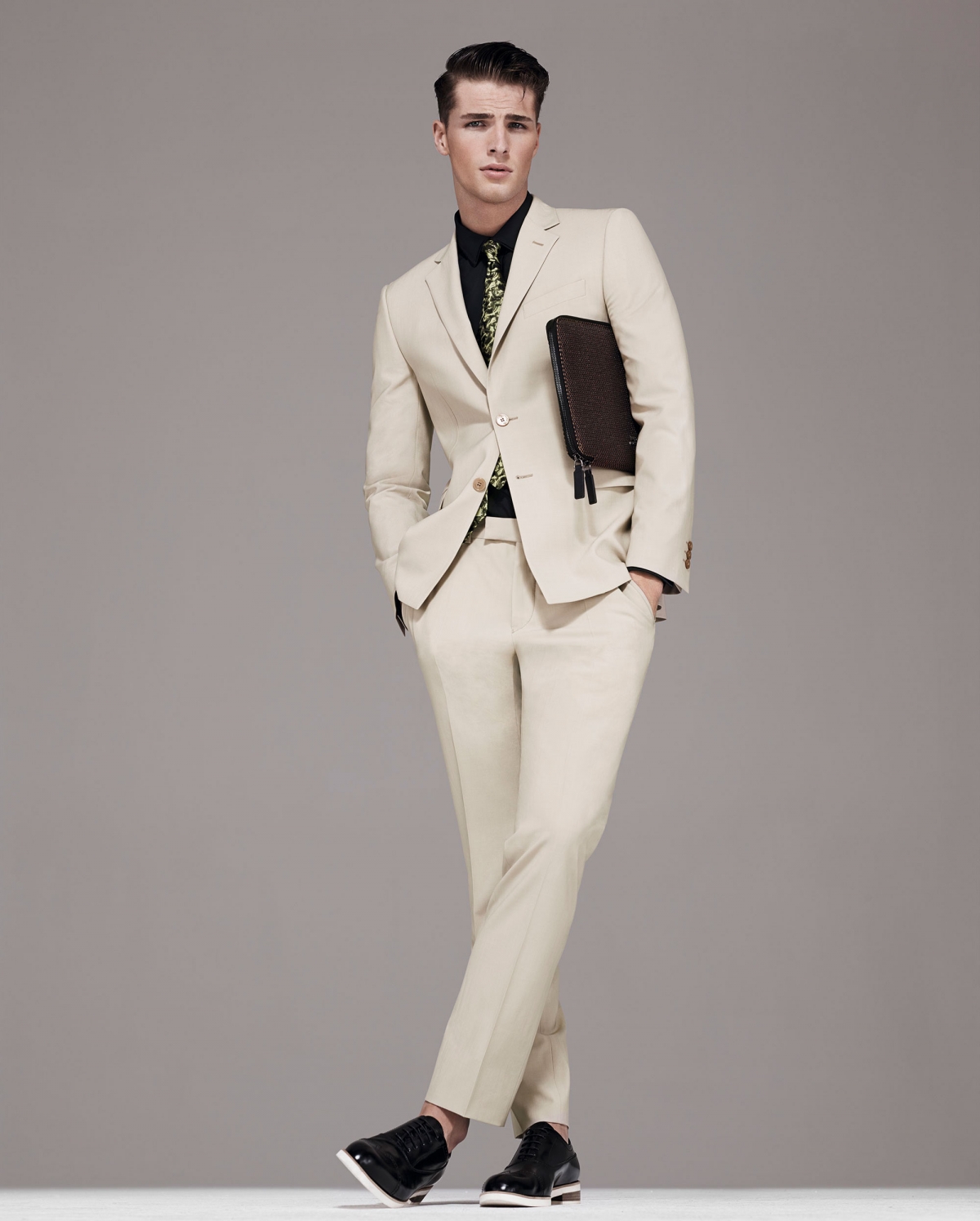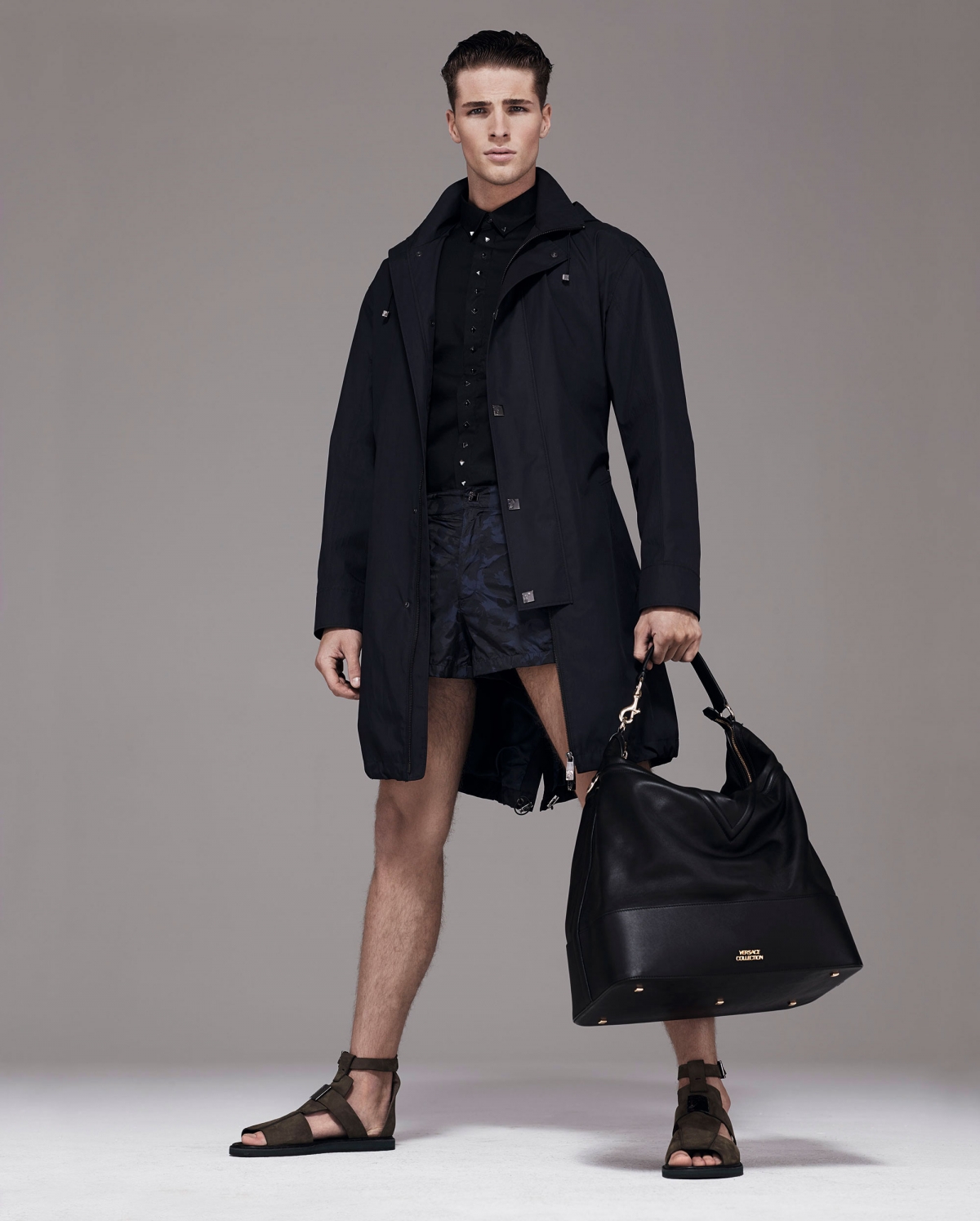 Versace Collection Spring/Summer 2014–British model Edward Wilding reunites once more with the house of Versace to appear in the spring/summer 2014 lookbook of the brand’s Versace Collection line. Finding inspiration in the label’s archives, Versace Collection’s spring offering, revisits some of the brand’s iconic features, like opulent prints, rich sorbet colors and tailored ensembles, projecting them in a new direction, thanks to precise cuts, innovative fabrics and modern volumes and proportions. Sharp two-piece suits in neutral tones or in more lively sorbet nuances, printed silk shirts and bomber jackets are just some of the standout pieces of the whole collection, while on the accessories field, metallic accents, patent leather shoes and suede sandals come up beside capacious leather and canvas handbags or with more working-oriented iPad cases.