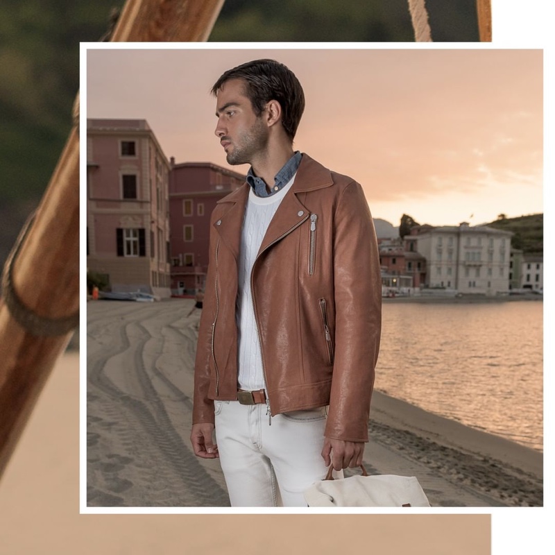 On the move, Pau Ramis dons a brown and white look for Eleventy's spring-summer 2020 campaign.Pin