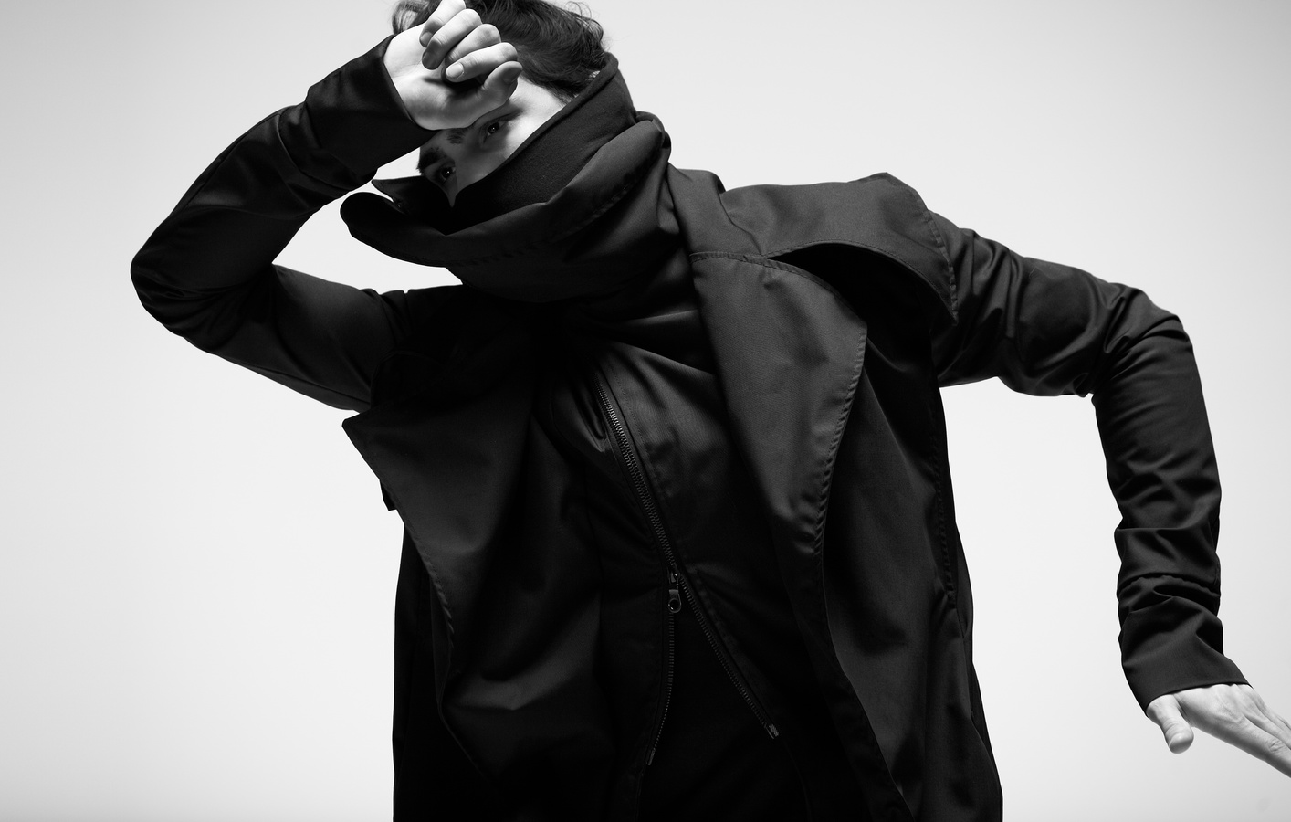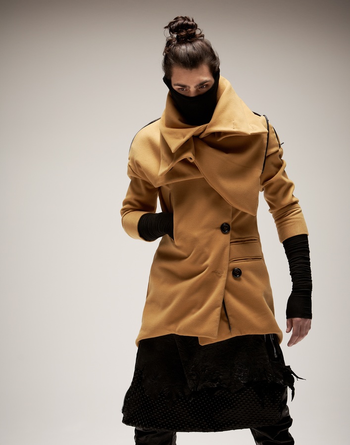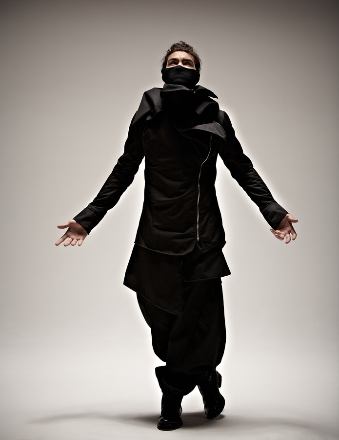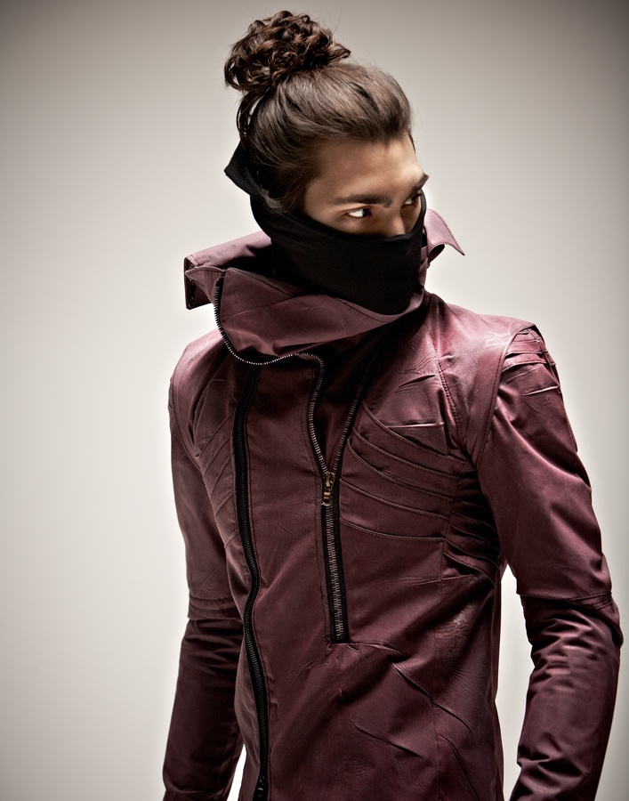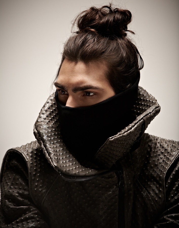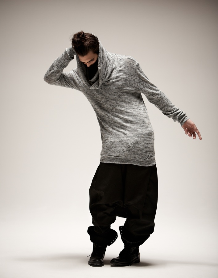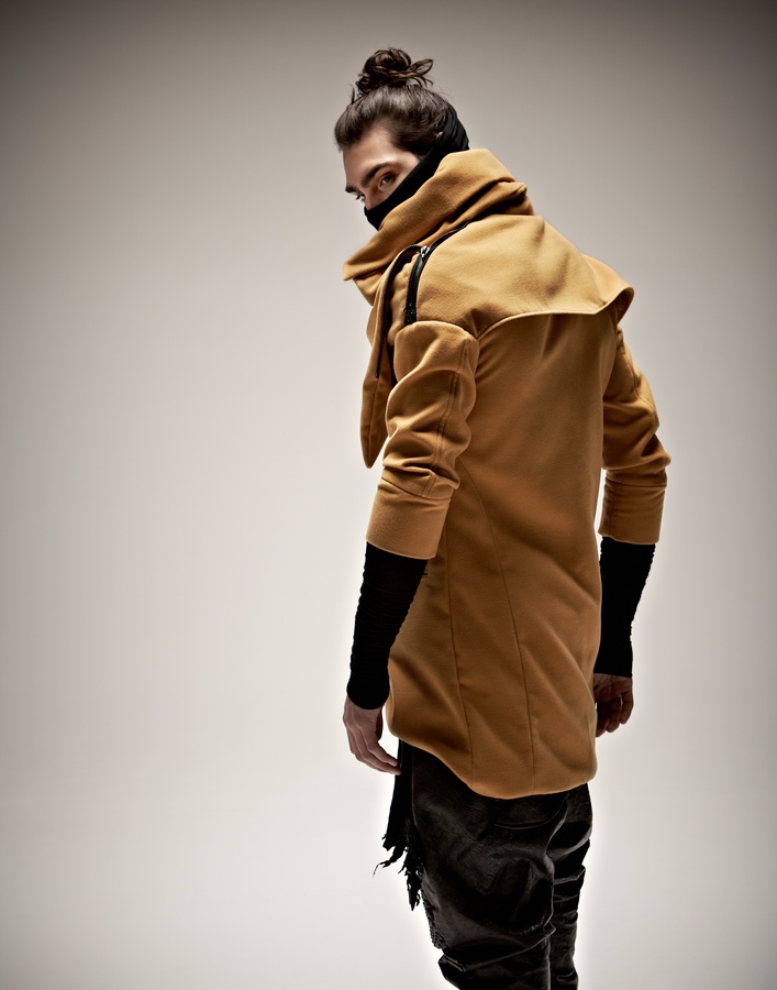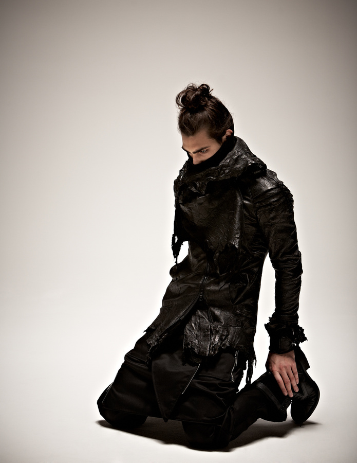 Never Forever–Dipping into a dramatic and dark aesthetic, designer Elliott Evan explores the male human form for his fall/winter 2013 collection. Asymmetrical hems, high collars, and rugged, textured fabrics play an integral role in this monochromatic collection. The silhouettes are structured and layered in an innovative manner, playing with the architecture of the male body and proportions for a visually arresting line.