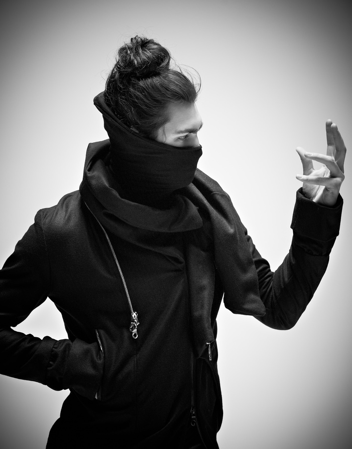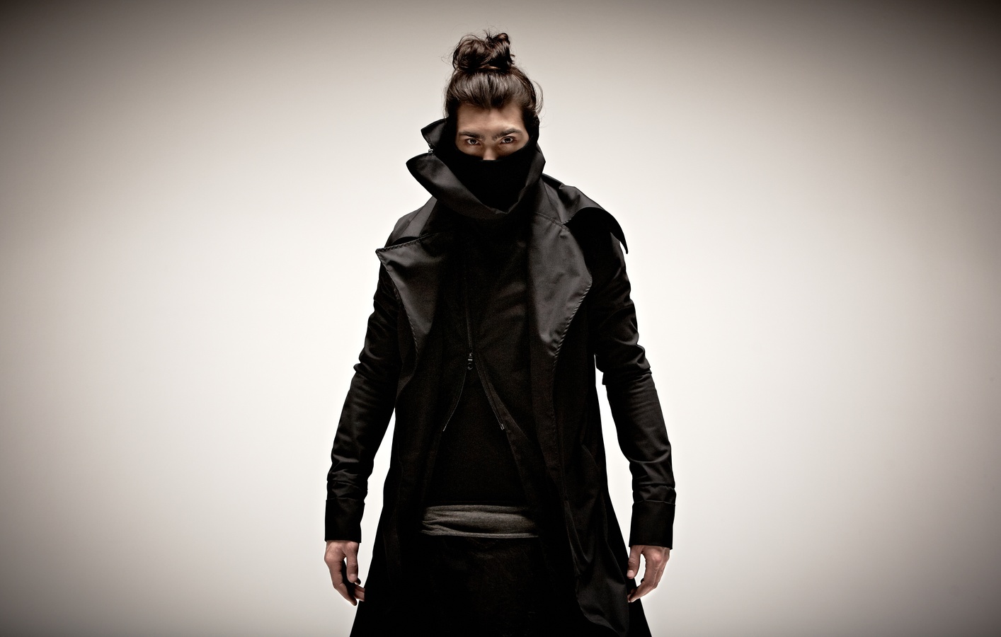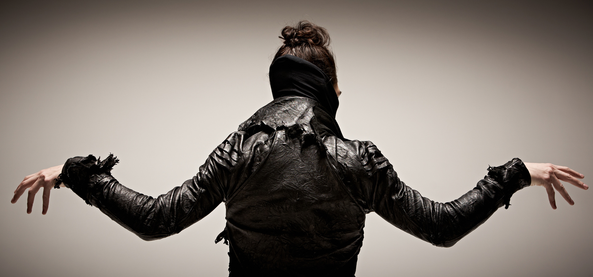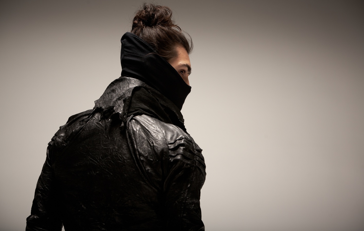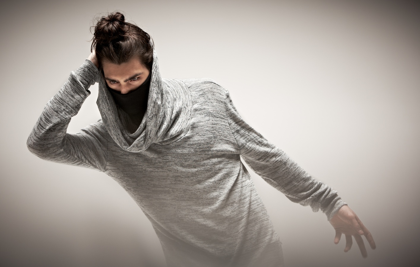 Never Forever–Dipping into a dramatic and dark aesthetic, designer Elliott Evan explores the male human form for his fall/winter 2013 collection. Asymmetrical hems, high collars, and rugged, textured fabrics play an integral role in this monochromatic collection. The silhouettes are structured and layered in an innovative manner, playing with the architecture of the male body and proportions for a visually arresting line.