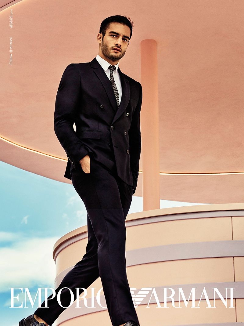 PinAleksandar Rusić dons a double-breasted suit for Emporio Armani’s spring-summer 2019 campaign.