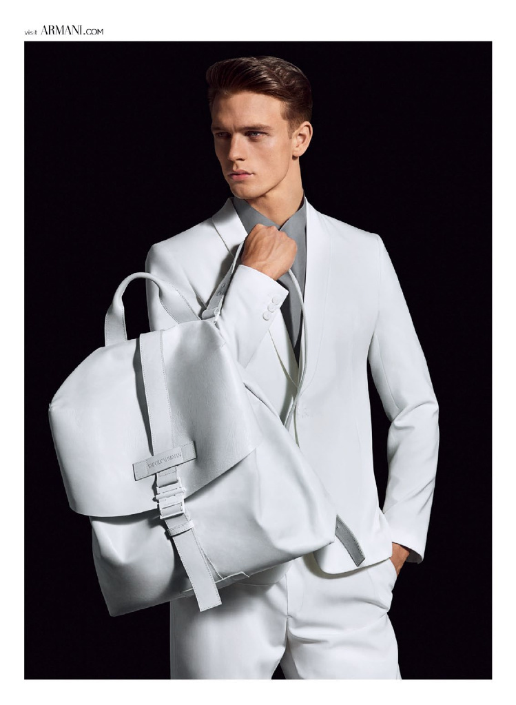 Emporio Armani Spring/Summer 2014 Campaign–Captured in a bare dark studio, Swedish model Benjamin Eidem is one of the faces enlisted by Italian fashion house Emporio Armani to star in the brand’s spring/summer 2014 outing. Decked out in sharp two-piece spring suits, Benjamin plays with neutral tones, completing his spring style with capacious leather bags in matching tones and textured shoes.