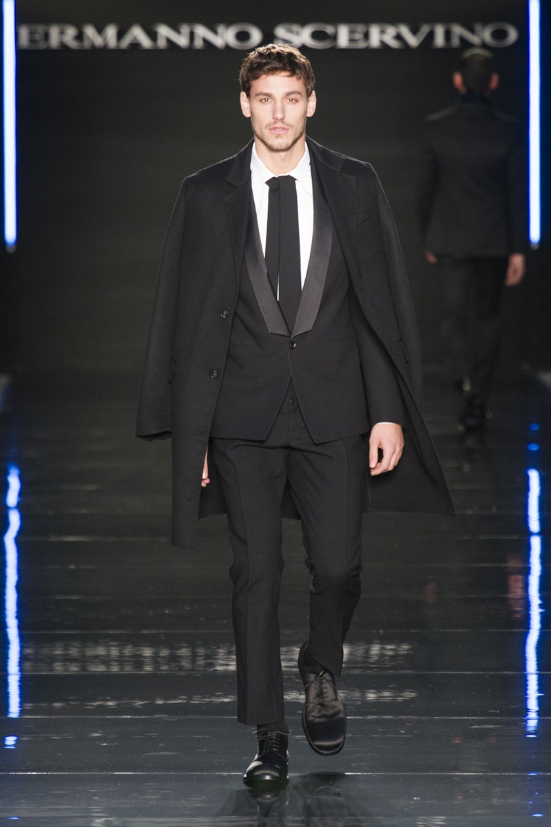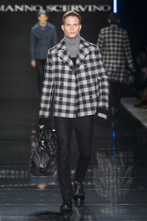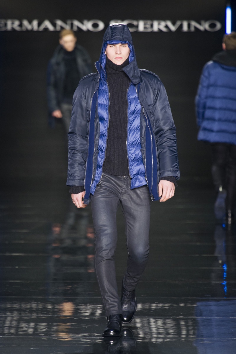 Ermanno Scervino Fall/Winter 2014–Touching upon nautical references, Ermanno Scervino returned to the Milano stage with a dark collection, executing sophisticated designs with a functional purpose. Checks kicked off the outing with a play on graphic proportions yielding short peacoats and relaxed double-breasted coats. Moving on, parkas in hues of blue were visually cool and refined for a semi-trim fit. Marle knitwear contrasted against houndstooth tailoring while clean crisp nautical stripes transitioned into classic pinstripes for a solid fall/winter 2014 outing.
