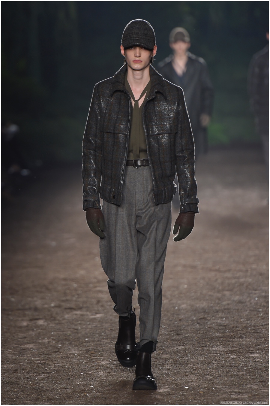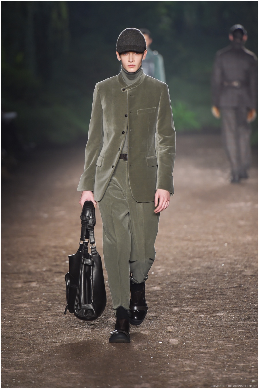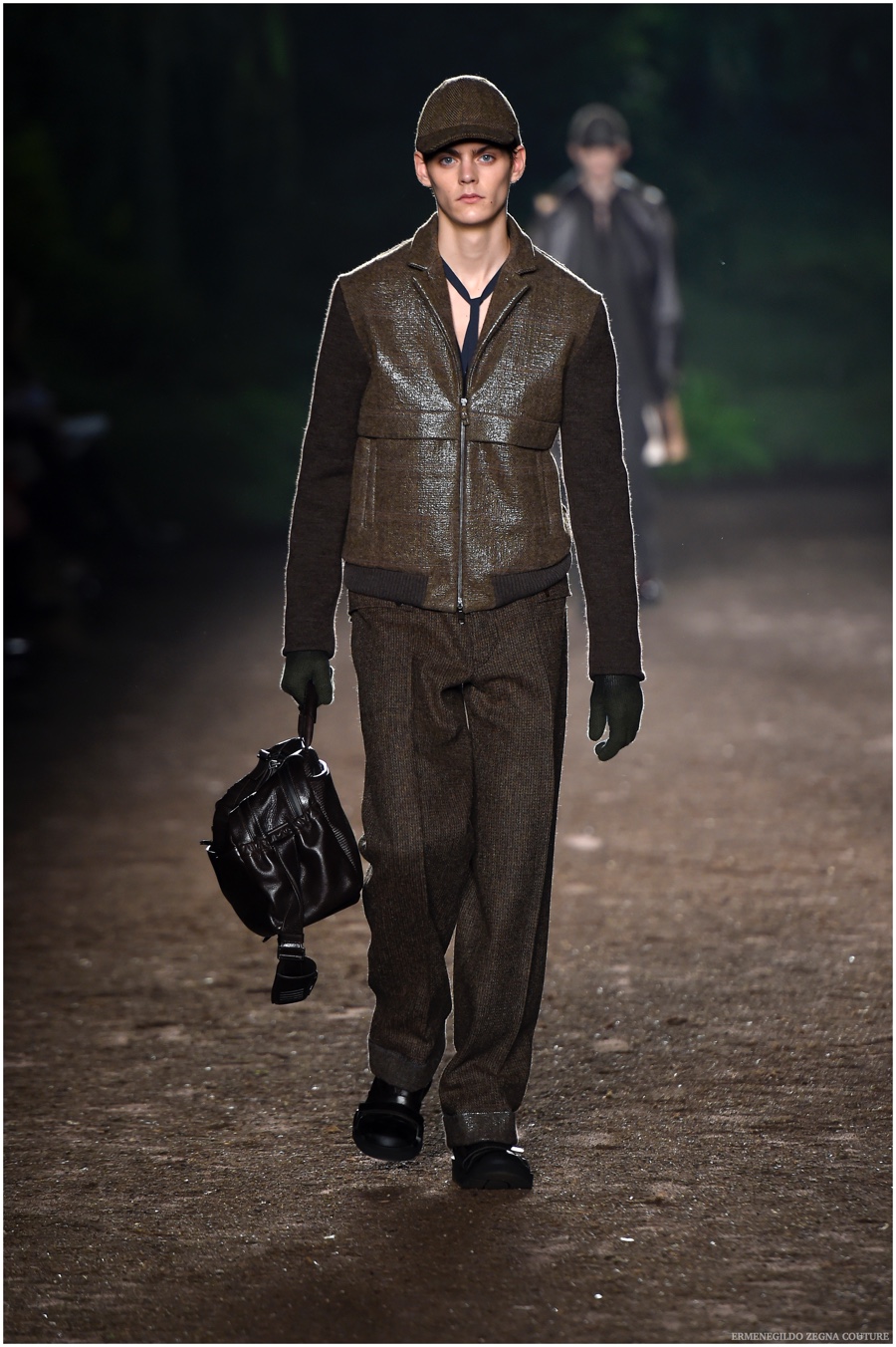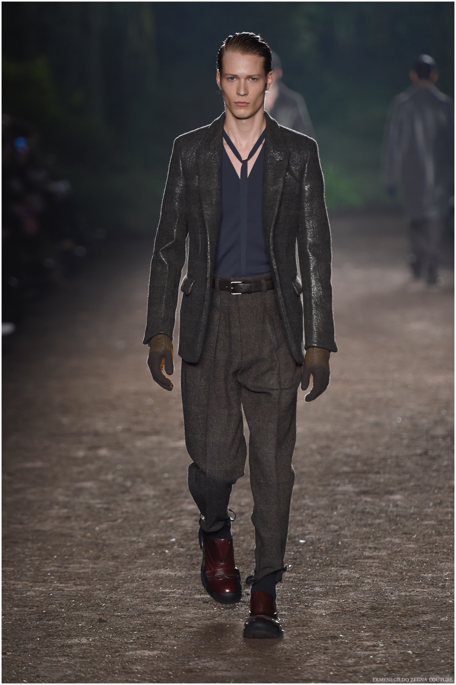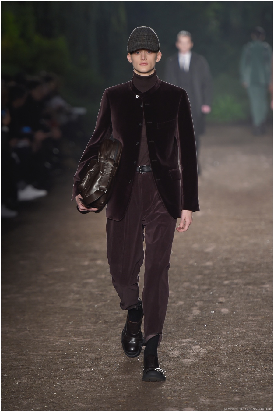 Ermenegildo Zegna Couture creative director Stefano Pilati champions the brand’s history of eco-sustainability for his fall-winter 2015 collection. Imagining the uniform of an eco-leader for the season, Pilati delivers a lineup that utilizes storied fabrics such as Harris Tweeds as a message of recycling. The idea of protecting the environment comes about with broken suits, composed of velvet and corduroy. Paired with tailored trousers that are often finished with elastic bottoms for a sporty purpose, jackets with pleats and gathers contribute to a collection dressed in shades of gray, brown, sage, red and dark blue. Bringing the season full circle, boots and shoes were covered by elements of protection while bags presented pieces for a hybrid market of luxury and sporty conscience.