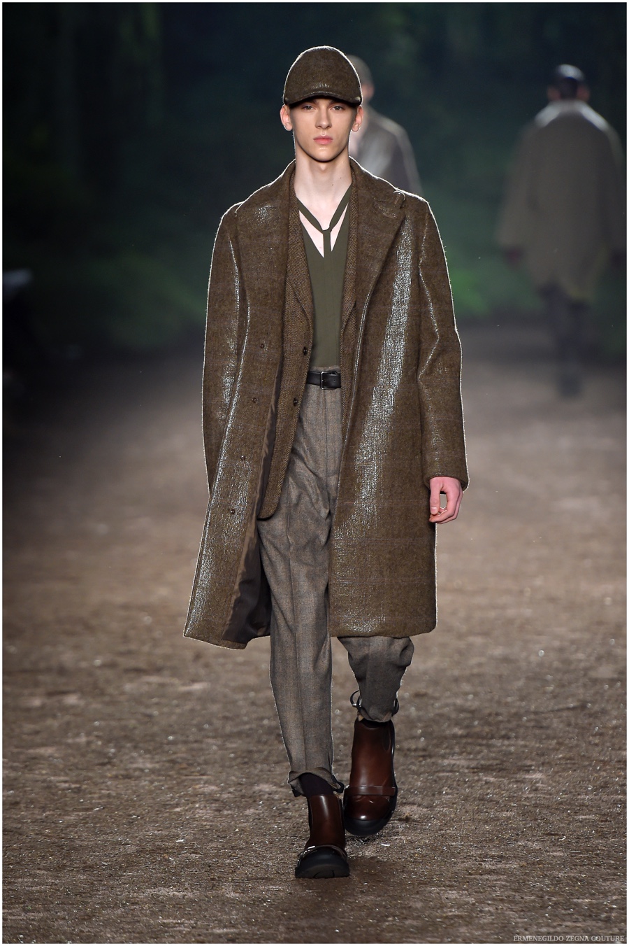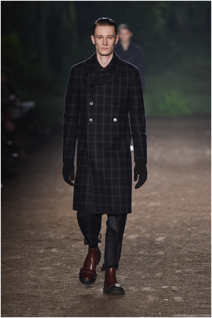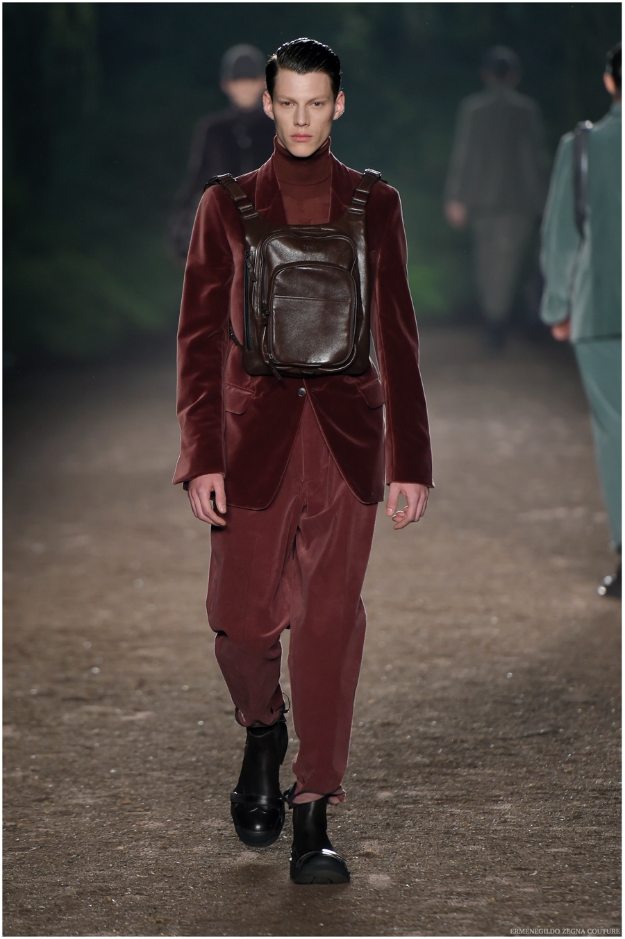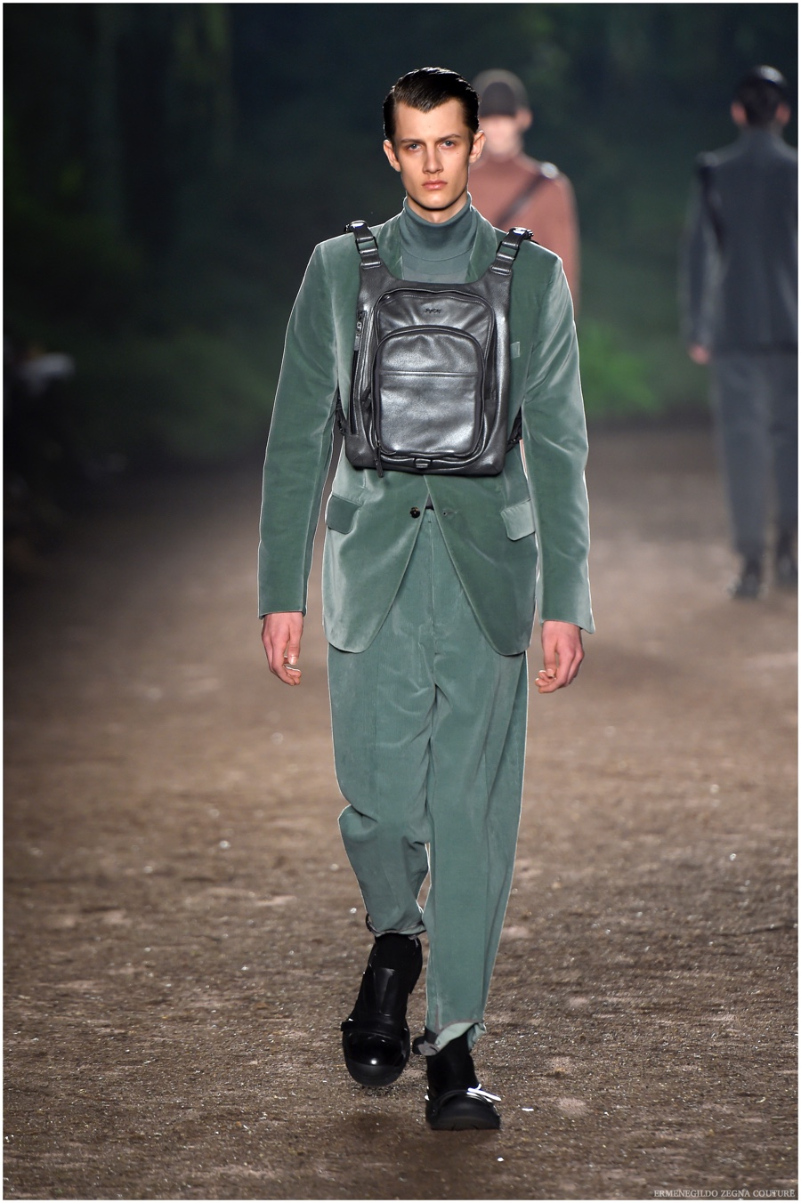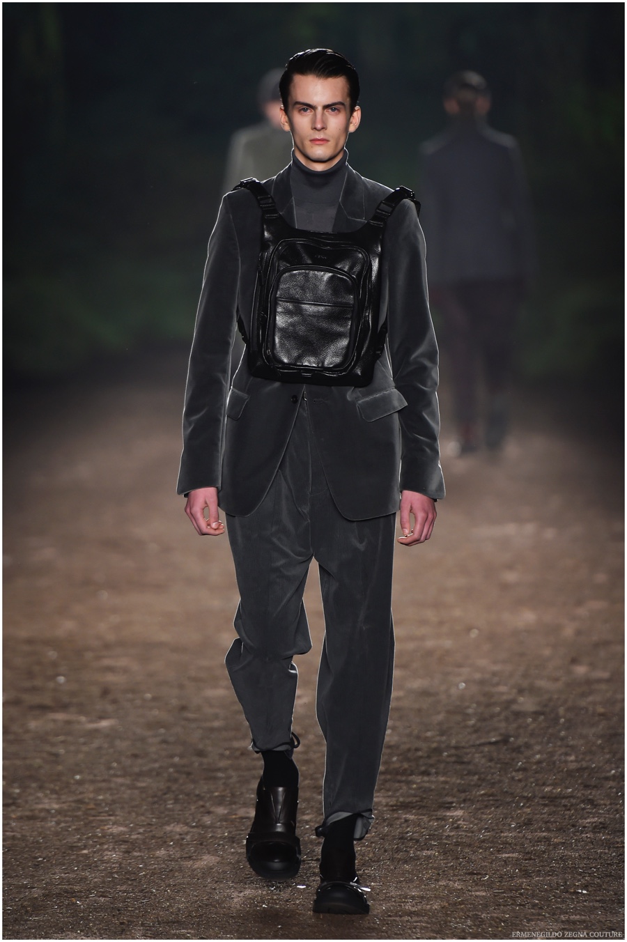 Ermenegildo Zegna Couture creative director Stefano Pilati champions the brand’s history of eco-sustainability for his fall-winter 2015 collection. Imagining the uniform of an eco-leader for the season, Pilati delivers a lineup that utilizes storied fabrics such as Harris Tweeds as a message of recycling. The idea of protecting the environment comes about with broken suits, composed of velvet and corduroy. Paired with tailored trousers that are often finished with elastic bottoms for a sporty purpose, jackets with pleats and gathers contribute to a collection dressed in shades of gray, brown, sage, red and dark blue. Bringing the season full circle, boots and shoes were covered by elements of protection while bags presented pieces for a hybrid market of luxury and sporty conscience.