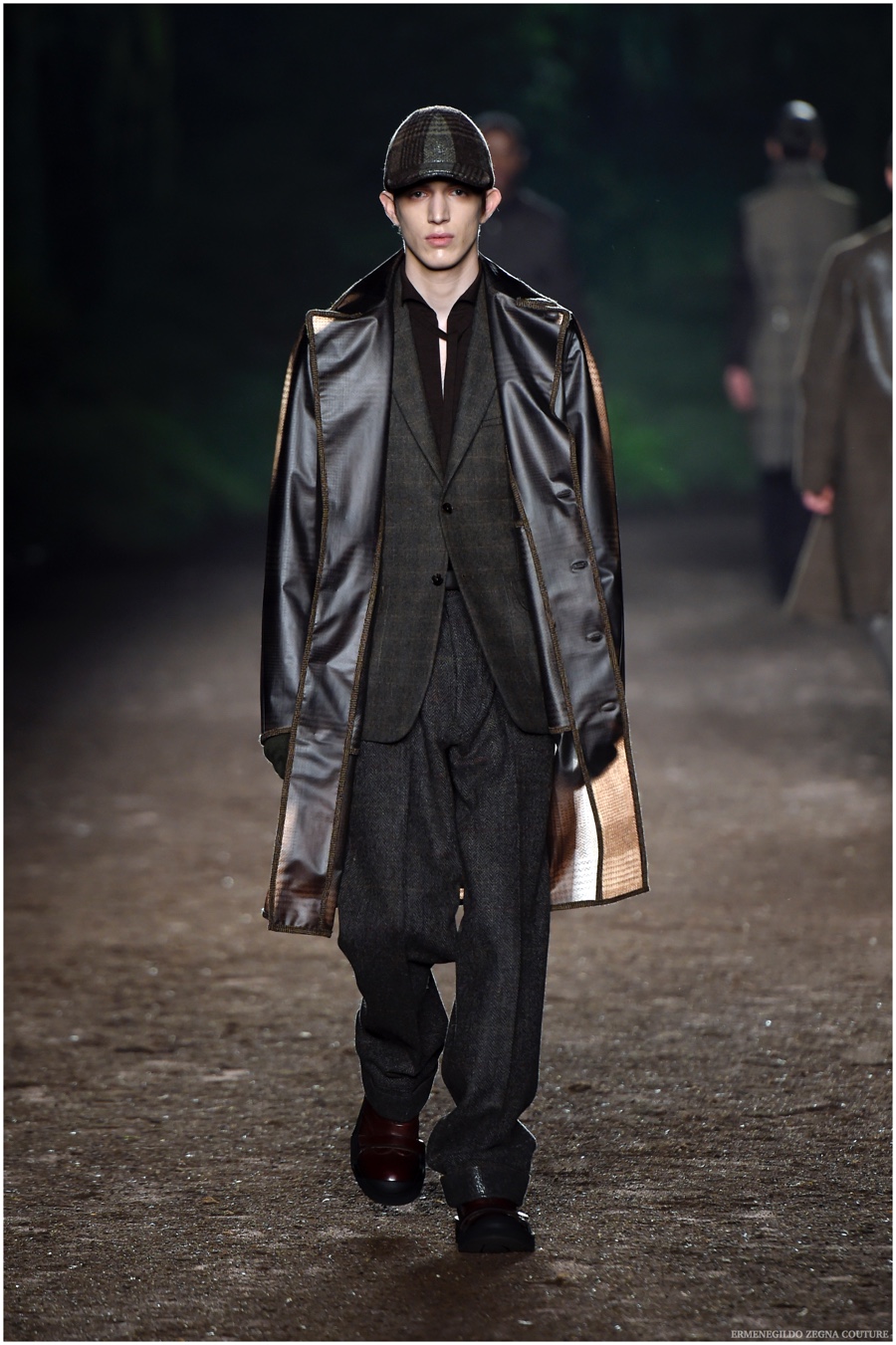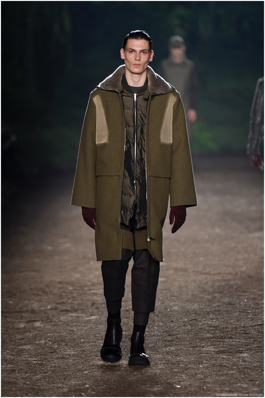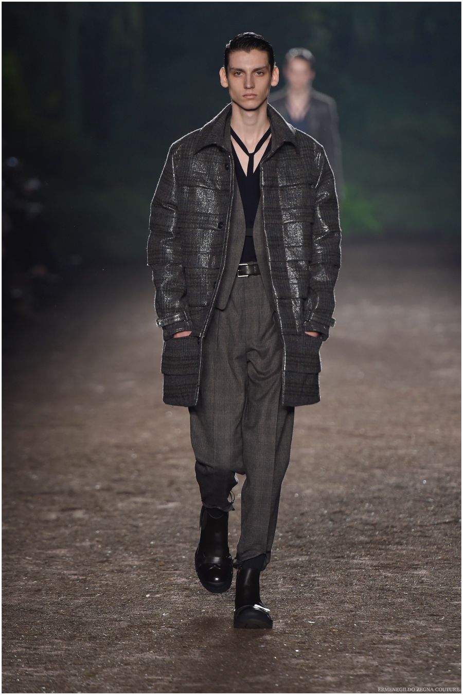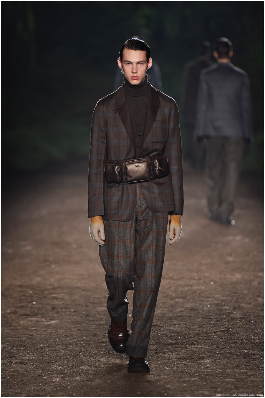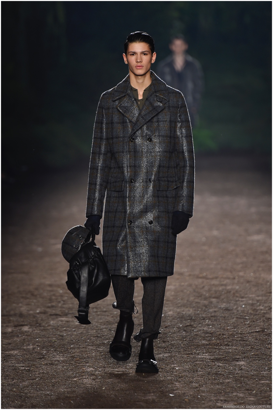 Ermenegildo Zegna Couture creative director Stefano Pilati champions the brand’s history of eco-sustainability for his fall-winter 2015 collection. Imagining the uniform of an eco-leader for the season, Pilati delivers a lineup that utilizes storied fabrics such as Harris Tweeds as a message of recycling. The idea of protecting the environment comes about with broken suits, composed of velvet and corduroy. Paired with tailored trousers that are often finished with elastic bottoms for a sporty purpose, jackets with pleats and gathers contribute to a collection dressed in shades of gray, brown, sage, red and dark blue. Bringing the season full circle, boots and shoes were covered by elements of protection while bags presented pieces for a hybrid market of luxury and sporty conscience.