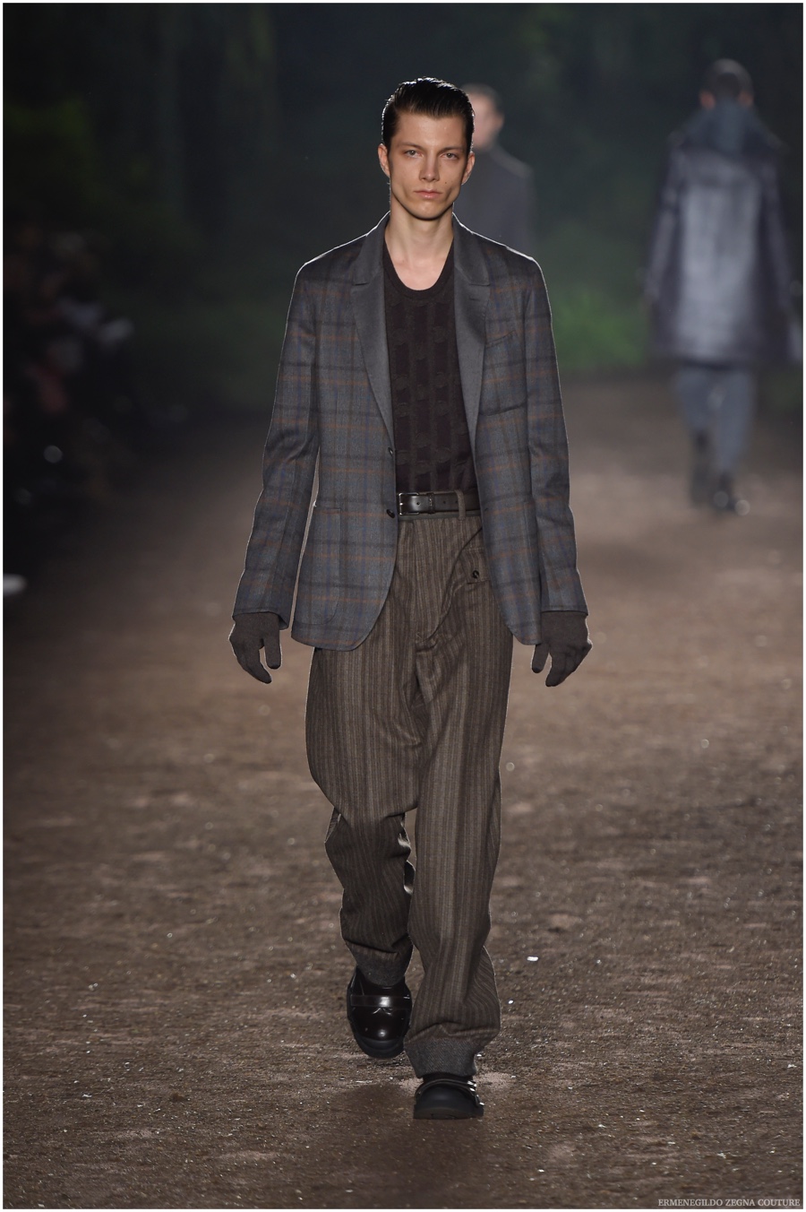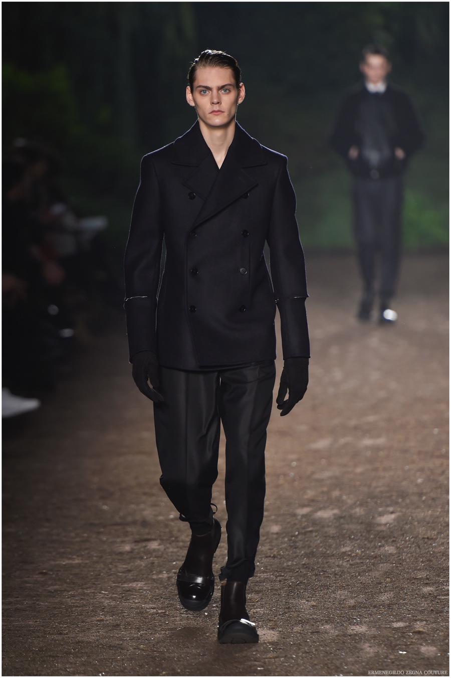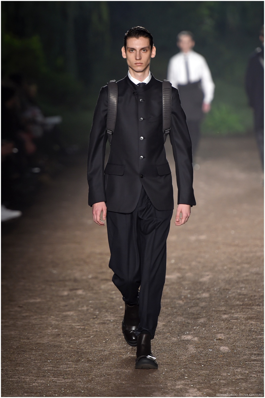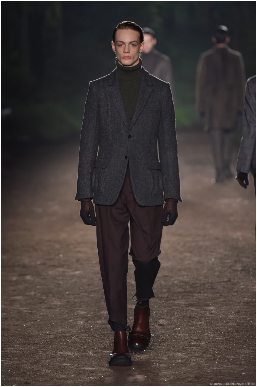 Ermenegildo Zegna Couture creative director Stefano Pilati champions the brand’s history of eco-sustainability for his fall-winter 2015 collection. Imagining the uniform of an eco-leader for the season, Pilati delivers a lineup that utilizes storied fabrics such as Harris Tweeds as a message of recycling. The idea of protecting the environment comes about with broken suits, composed of velvet and corduroy. Paired with tailored trousers that are often finished with elastic bottoms for a sporty purpose, jackets with pleats and gathers contribute to a collection dressed in shades of gray, brown, sage, red and dark blue. Bringing the season full circle, boots and shoes were covered by elements of protection while bags presented pieces for a hybrid market of luxury and sporty conscience.