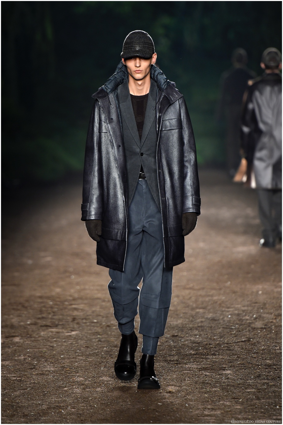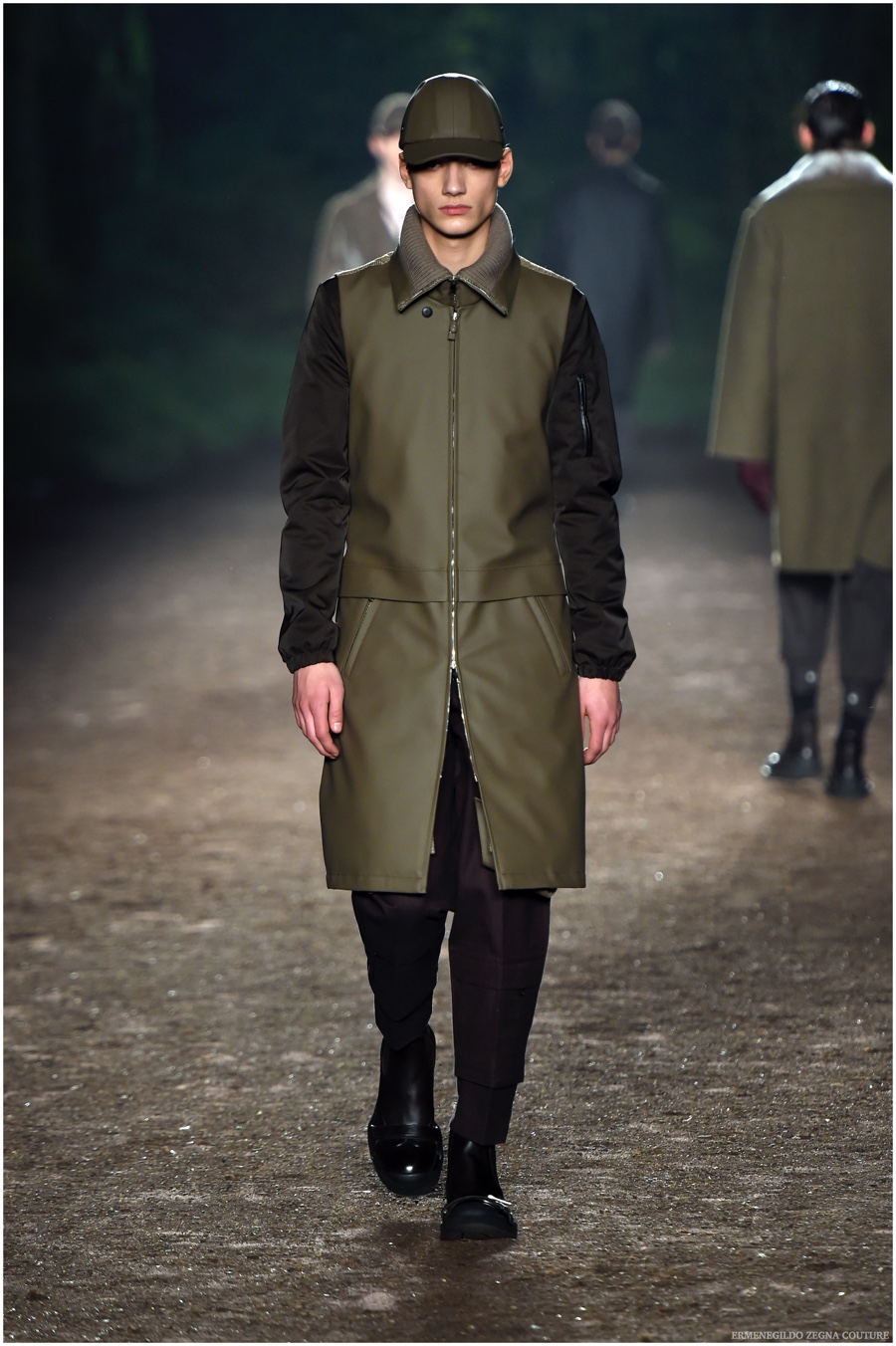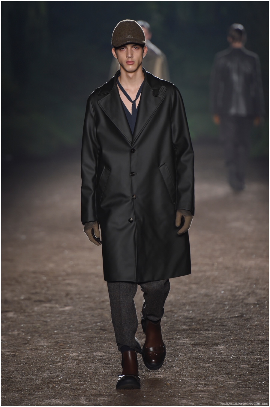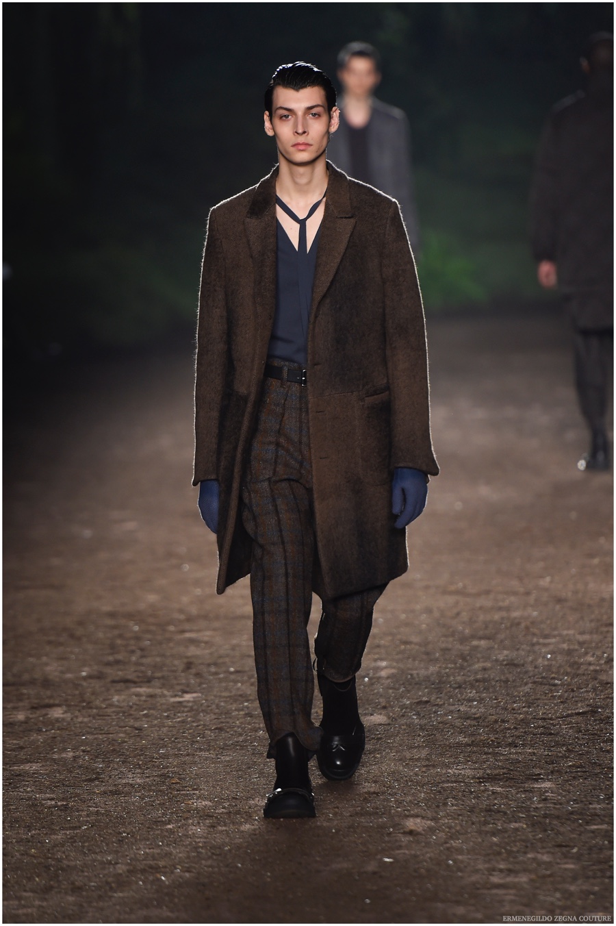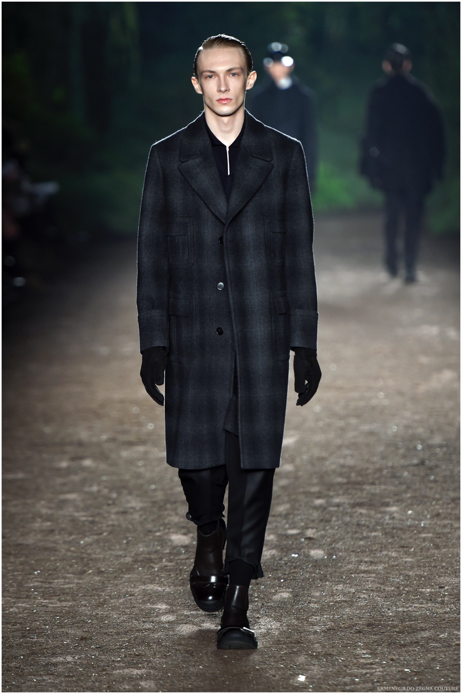 Ermenegildo Zegna Couture creative director Stefano Pilati champions the brand’s history of eco-sustainability for his fall-winter 2015 collection. Imagining the uniform of an eco-leader for the season, Pilati delivers a lineup that utilizes storied fabrics such as Harris Tweeds as a message of recycling. The idea of protecting the environment comes about with broken suits, composed of velvet and corduroy. Paired with tailored trousers that are often finished with elastic bottoms for a sporty purpose, jackets with pleats and gathers contribute to a collection dressed in shades of gray, brown, sage, red and dark blue. Bringing the season full circle, boots and shoes were covered by elements of protection while bags presented pieces for a hybrid market of luxury and sporty conscience.