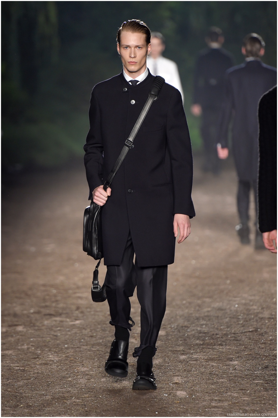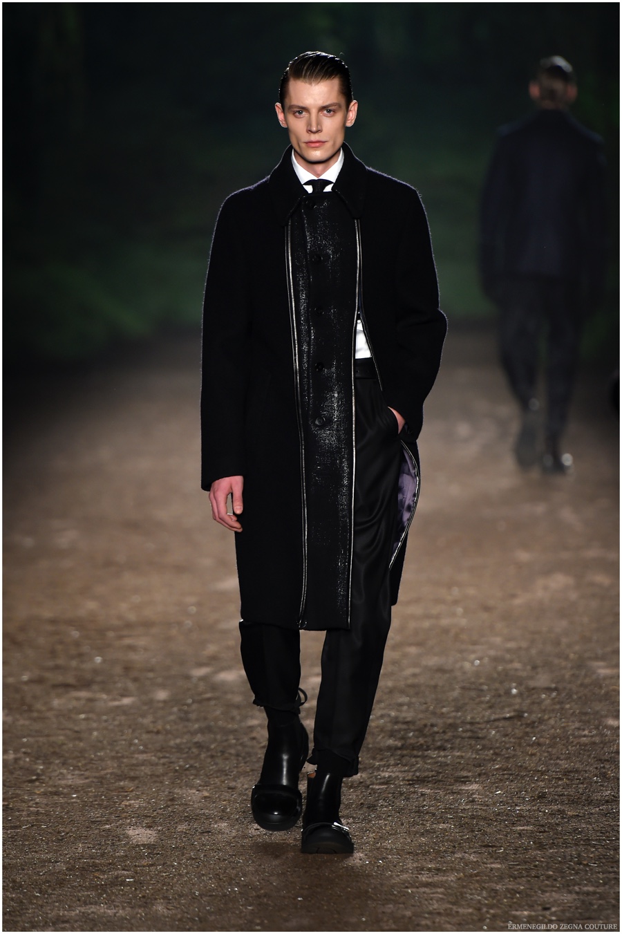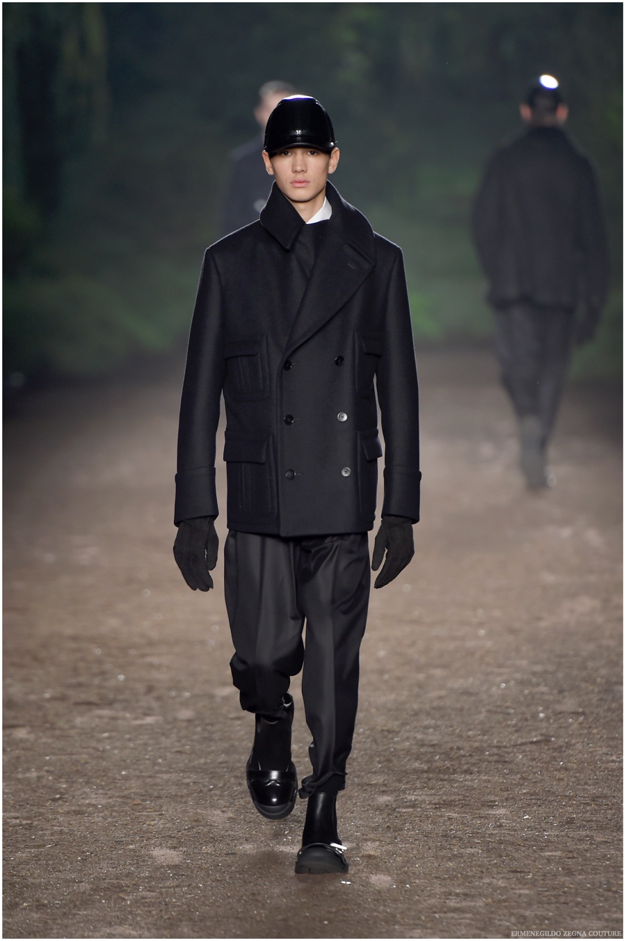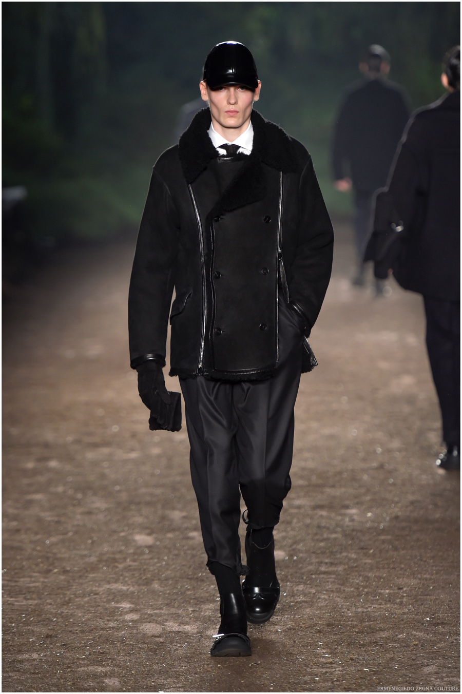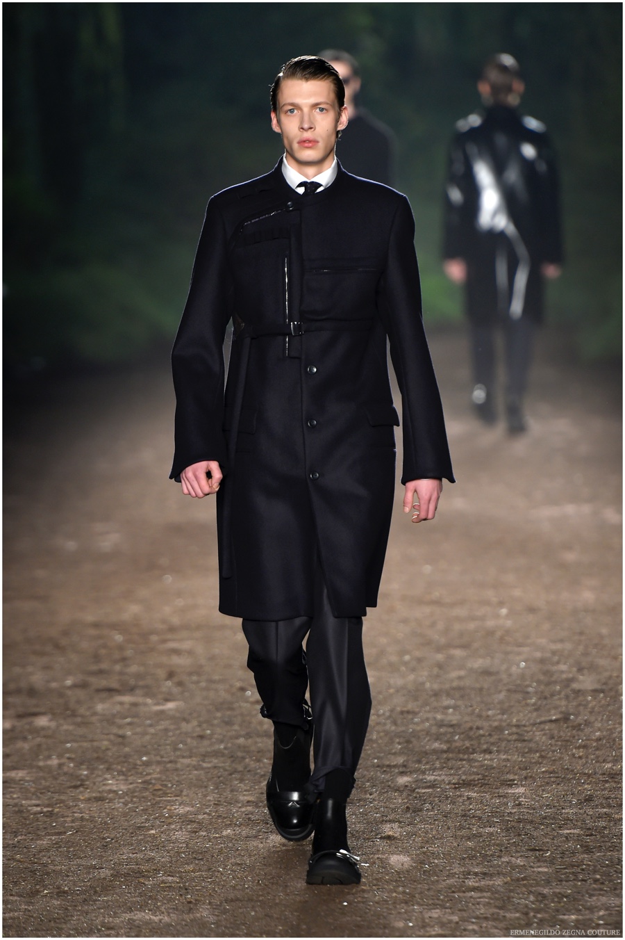 Ermenegildo Zegna Couture creative director Stefano Pilati champions the brand’s history of eco-sustainability for his fall-winter 2015 collection. Imagining the uniform of an eco-leader for the season, Pilati delivers a lineup that utilizes storied fabrics such as Harris Tweeds as a message of recycling. The idea of protecting the environment comes about with broken suits, composed of velvet and corduroy. Paired with tailored trousers that are often finished with elastic bottoms for a sporty purpose, jackets with pleats and gathers contribute to a collection dressed in shades of gray, brown, sage, red and dark blue. Bringing the season full circle, boots and shoes were covered by elements of protection while bags presented pieces for a hybrid market of luxury and sporty conscience.