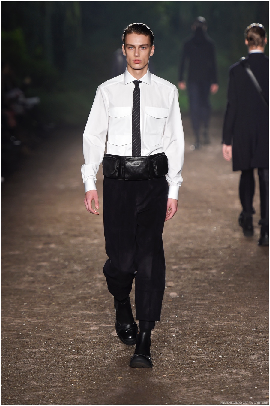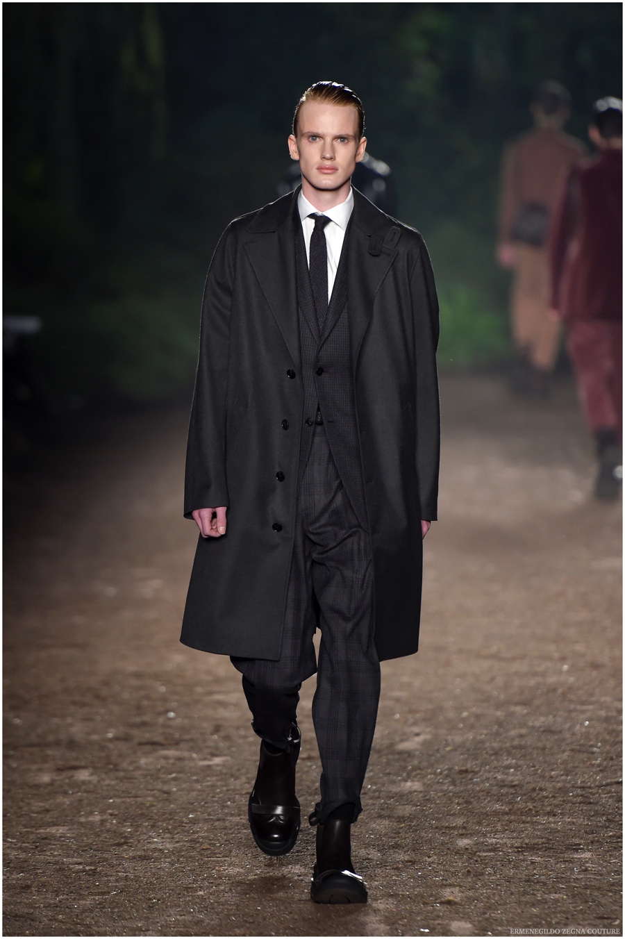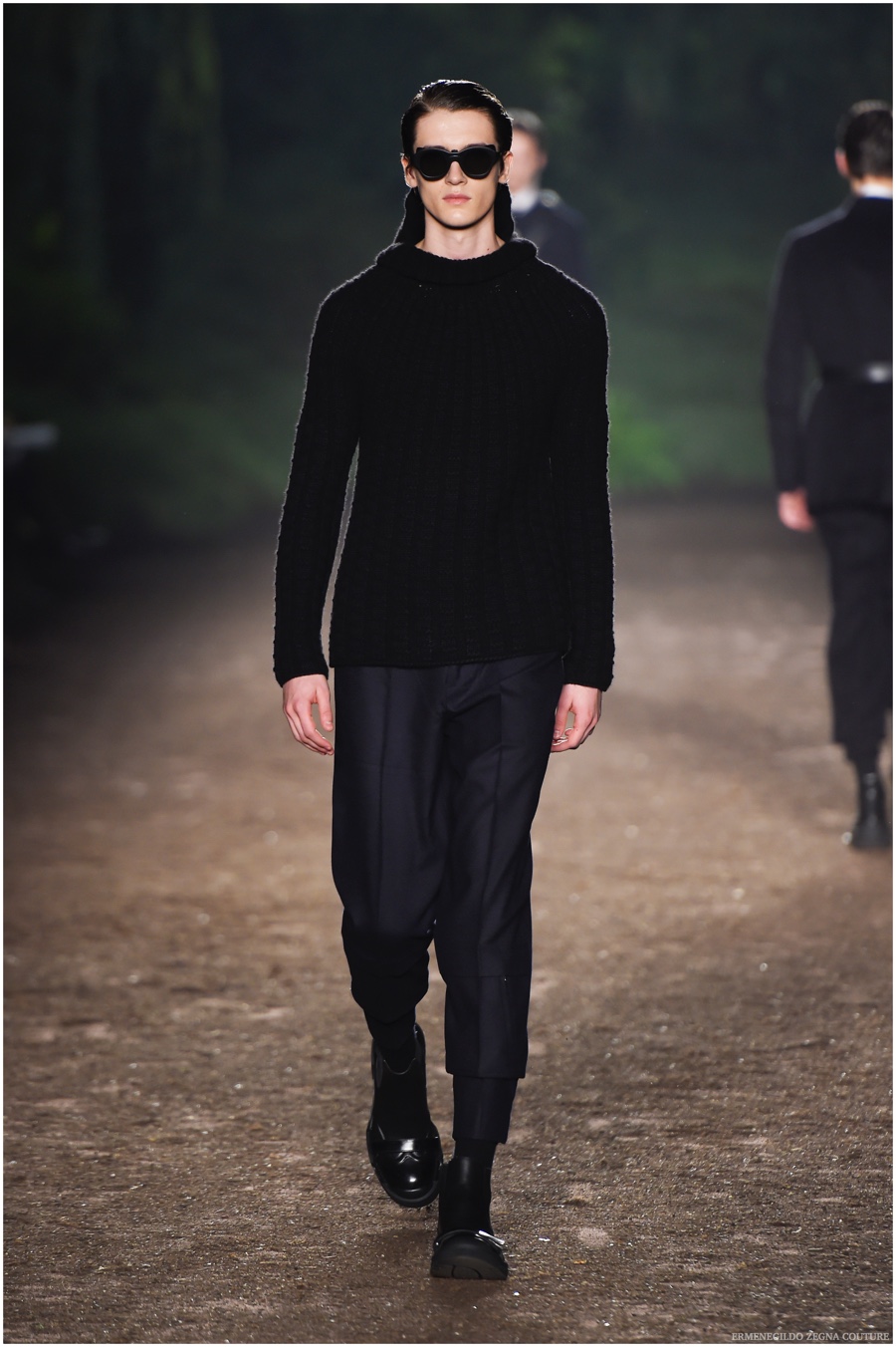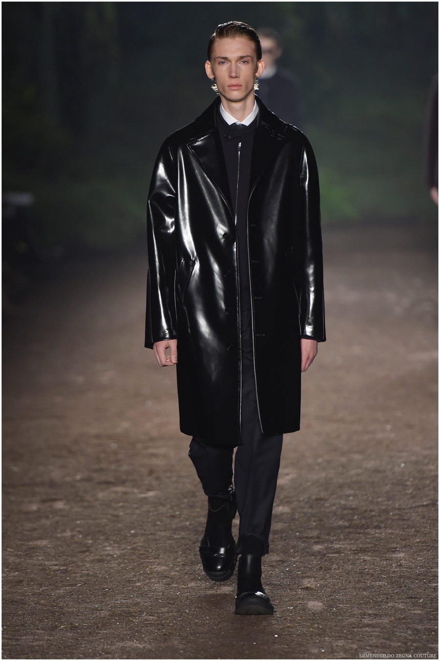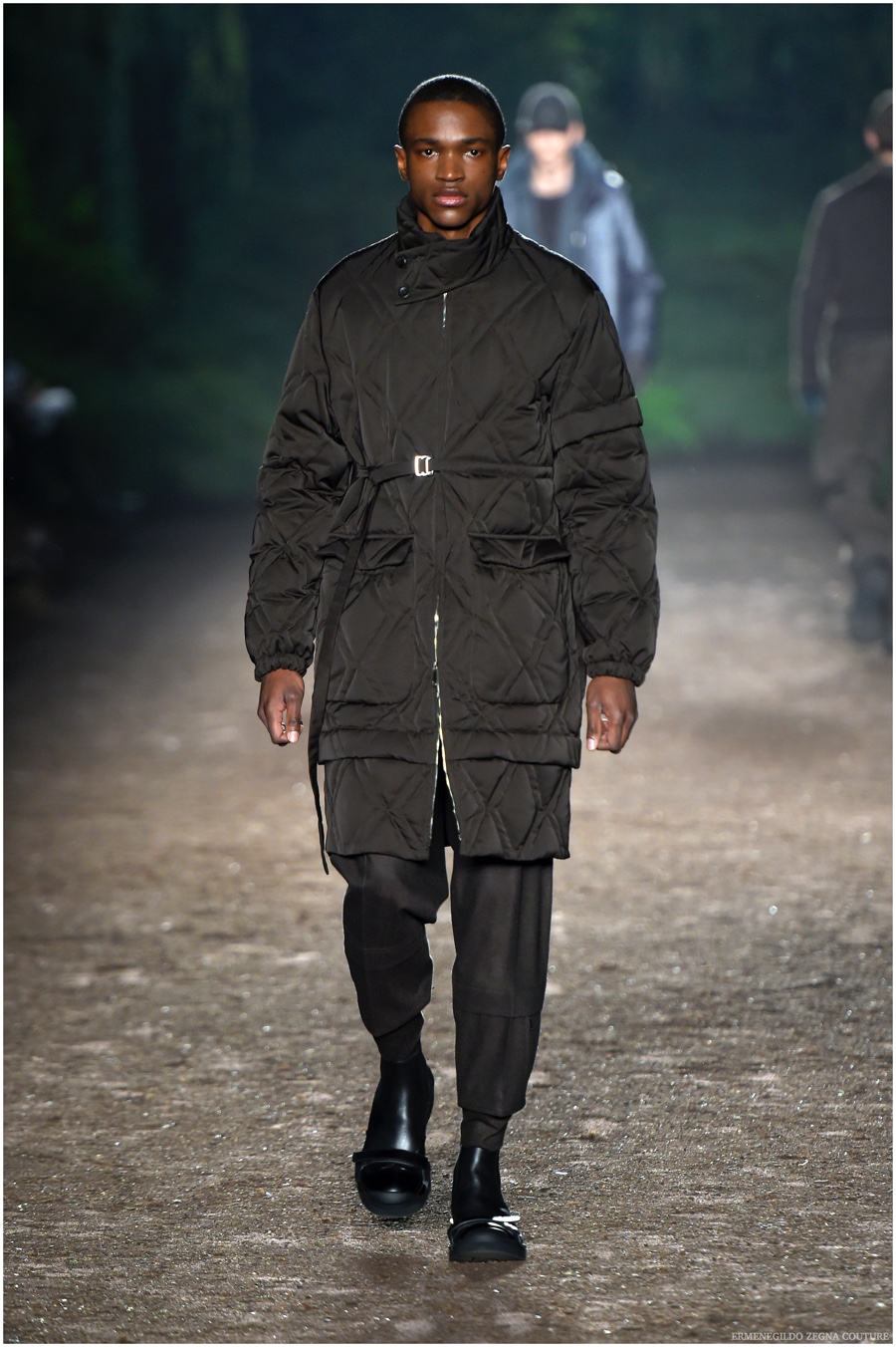 Ermenegildo Zegna Couture creative director Stefano Pilati champions the brand’s history of eco-sustainability for his fall-winter 2015 collection. Imagining the uniform of an eco-leader for the season, Pilati delivers a lineup that utilizes storied fabrics such as Harris Tweeds as a message of recycling. The idea of protecting the environment comes about with broken suits, composed of velvet and corduroy. Paired with tailored trousers that are often finished with elastic bottoms for a sporty purpose, jackets with pleats and gathers contribute to a collection dressed in shades of gray, brown, sage, red and dark blue. Bringing the season full circle, boots and shoes were covered by elements of protection while bags presented pieces for a hybrid market of luxury and sporty conscience.