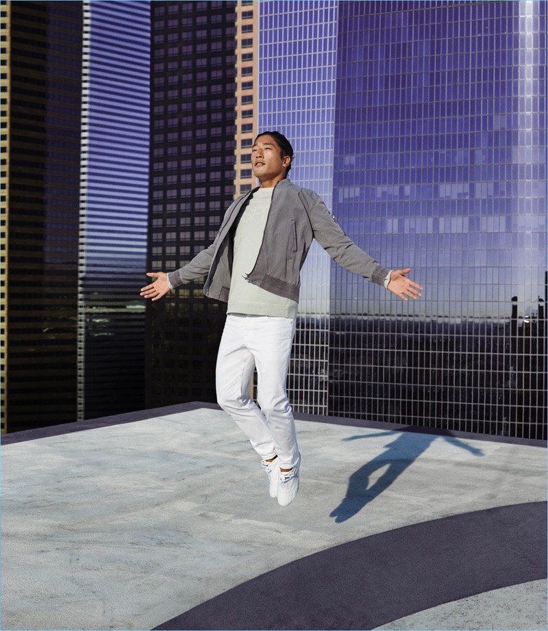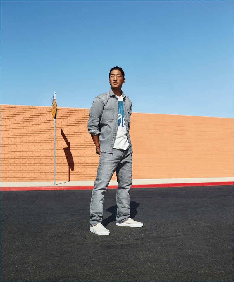 The pair sports casual jackets with distressed denim for the charming occasion. Meanwhile, former Survivor contestant Yung “Woo” Hwang inspires as the face of Esprit’s mainline. Embracing relaxed staples, Woo wears everyday items such as a grey bomber jacket and white denim jeans.