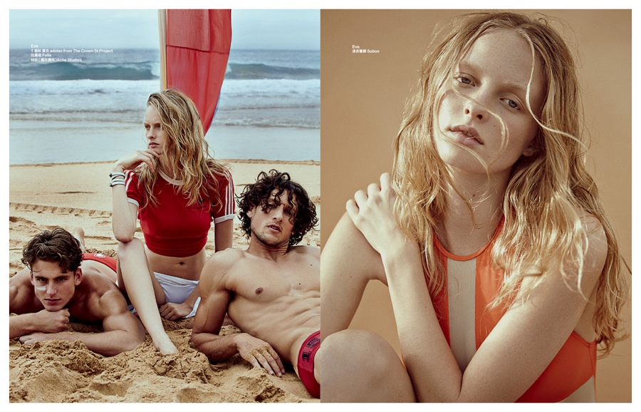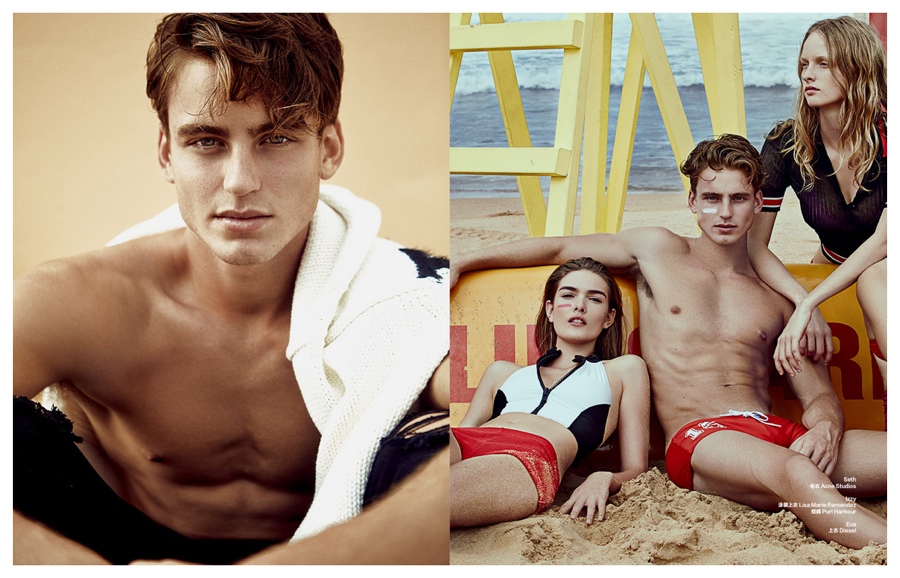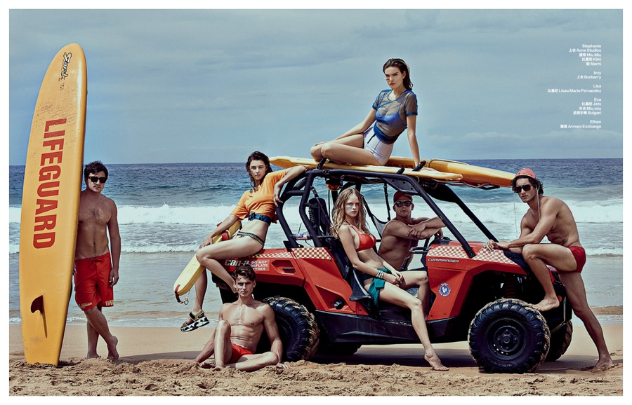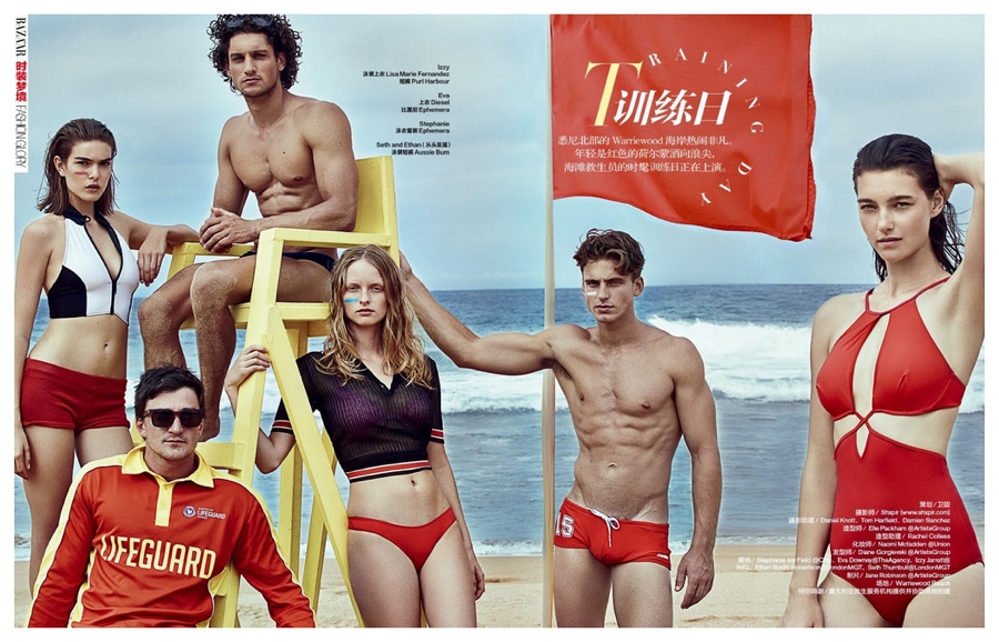 Following a Modern Weekly China story featuring Lucky Blue Smith, fashion photographer Shxpir returns to our pages with an editorial for the May 2015 issue of Harper’s Bazaar China. Summer is front and center for an engaging spread inspired by lifeguards on duty. Styled by Elle Packham, models Ethan Robertson and Seth Turnbull answer the call, joining beauties Stephanie Joy Field, Eva Downey and Izzy Jarrett for quite the outing.