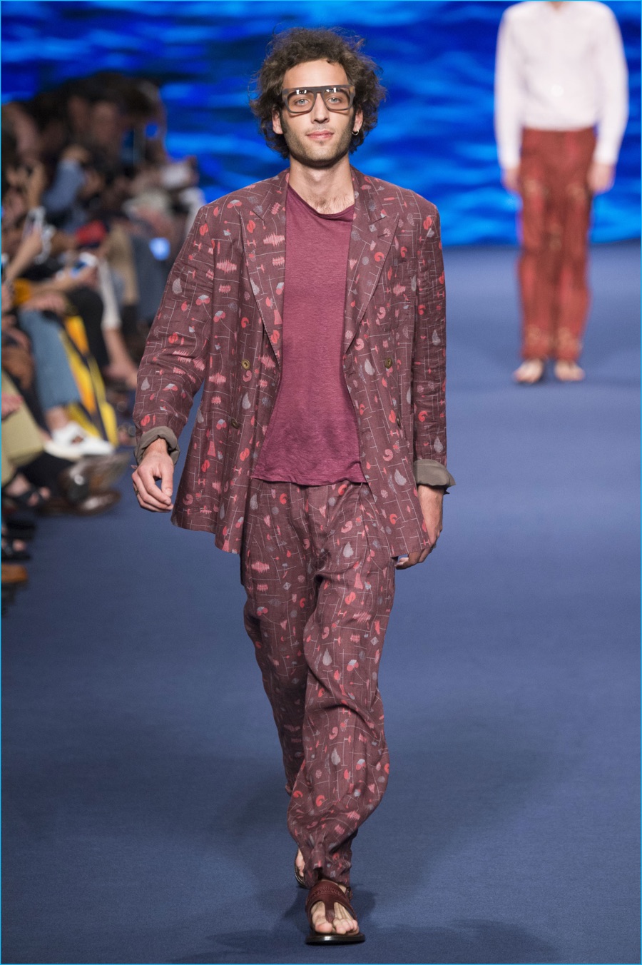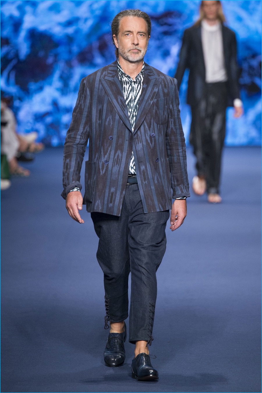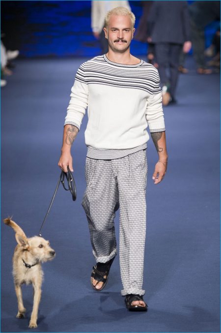 Etro’s spring-summer 2017 runway show served as a meeting of friends and family as Kean Etro recruited those closest to him to hit the catwalk alongside models. Muted tones were married with relaxed silhouettes as the Etro man took on a grounded approach to the fashion house’s celebrated penchant for prints. Unstructured suits were joined by band collar shirts, striped tees, lightweight knit sweaters and leisure bombers. Oversized coats, slouchy tees, overshirts, patterned polo shirts and summerweight field jackets brought the lineup to a successful finish.