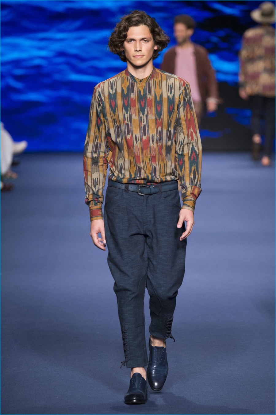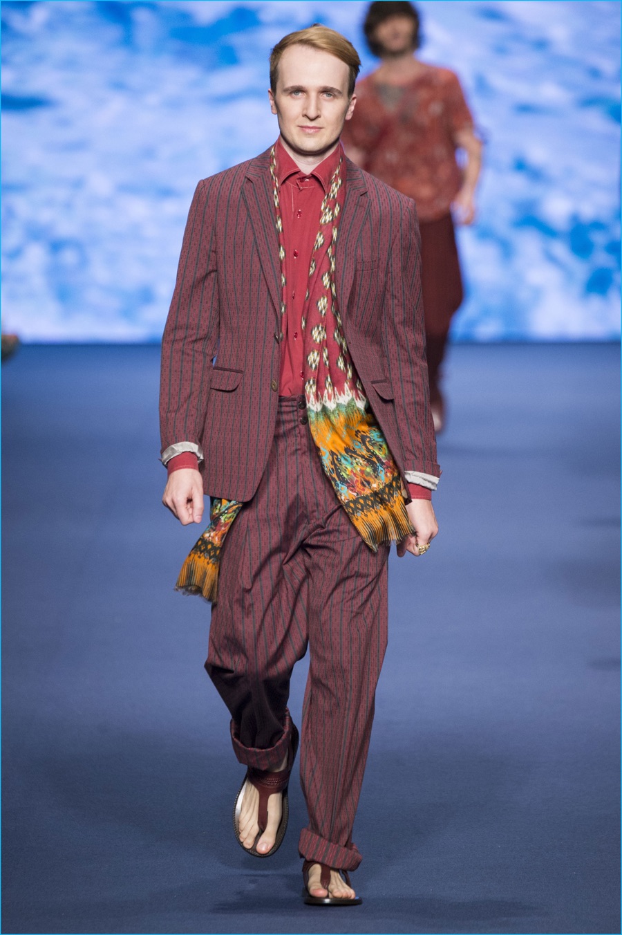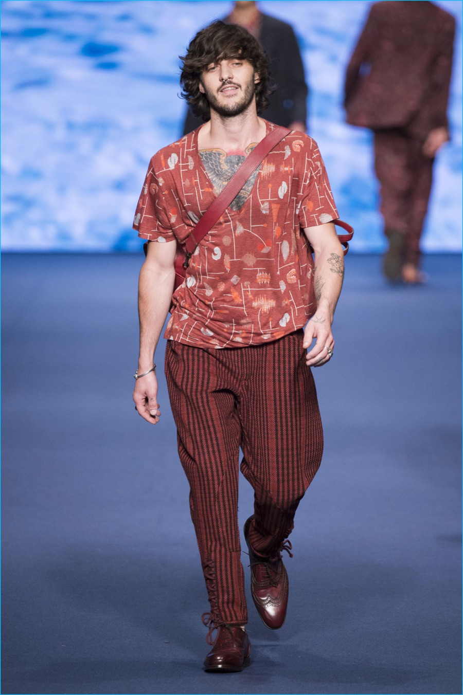 Etro’s spring-summer 2017 runway show served as a meeting of friends and family as Kean Etro recruited those closest to him to hit the catwalk alongside models. Muted tones were married with relaxed silhouettes as the Etro man took on a grounded approach to the fashion house’s celebrated penchant for prints. Unstructured suits were joined by band collar shirts, striped tees, lightweight knit sweaters and leisure bombers. Oversized coats, slouchy tees, overshirts, patterned polo shirts and summerweight field jackets brought the lineup to a successful finish.