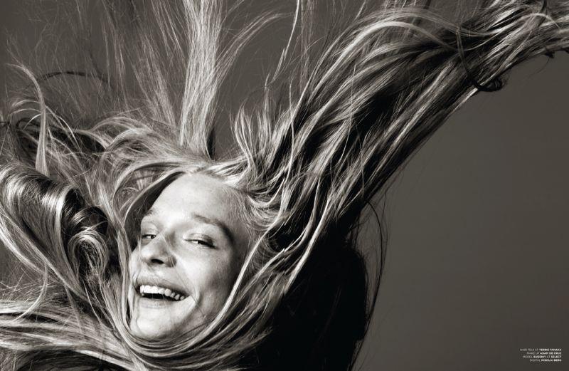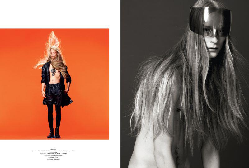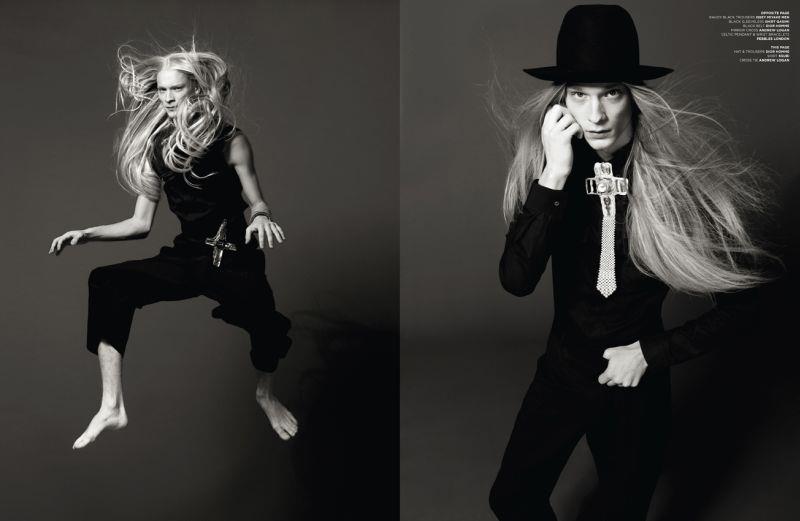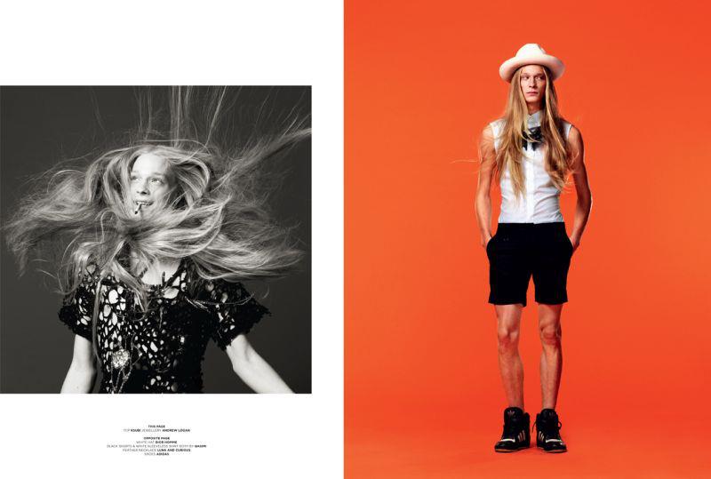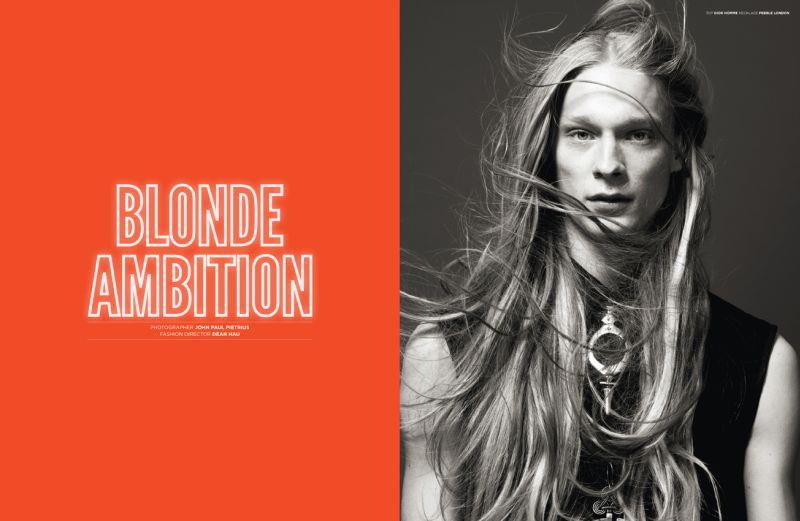 Androgyny-Photographer John-Paul Pietrus and stylist Dean Hau team up for a fashion story featuring Select model Eugeniy Sauchenka published in the pages of Seventh Man magazine. Captured in minimal studio portraits, the blond model poses against a vivid orange background or in sophisticated black & white images sporting pieces from the likes of Dior Homme and Burberry Prorsum, or simply making his blond locks floating in the air.
