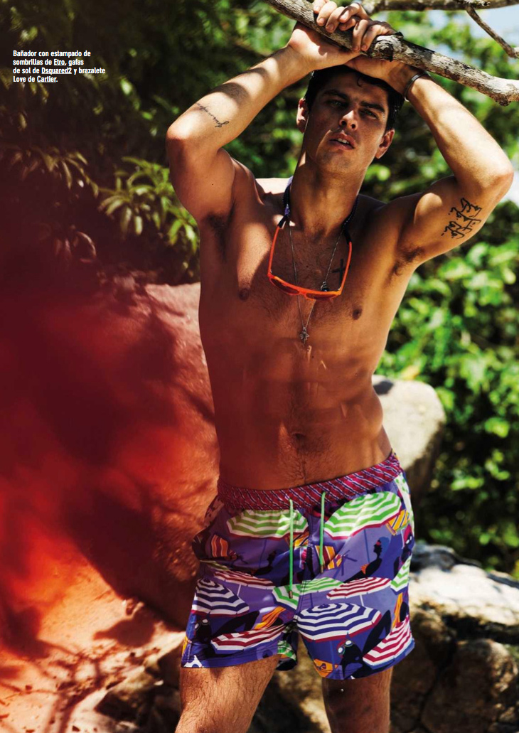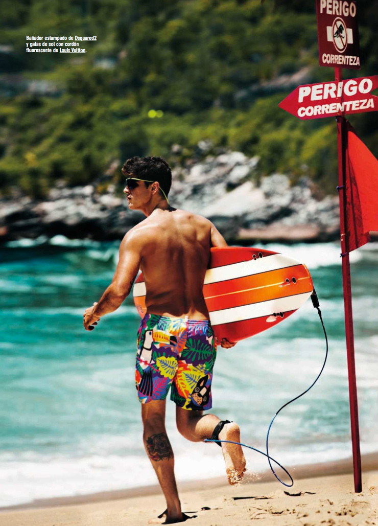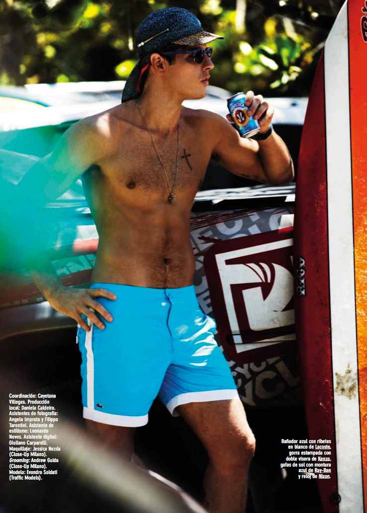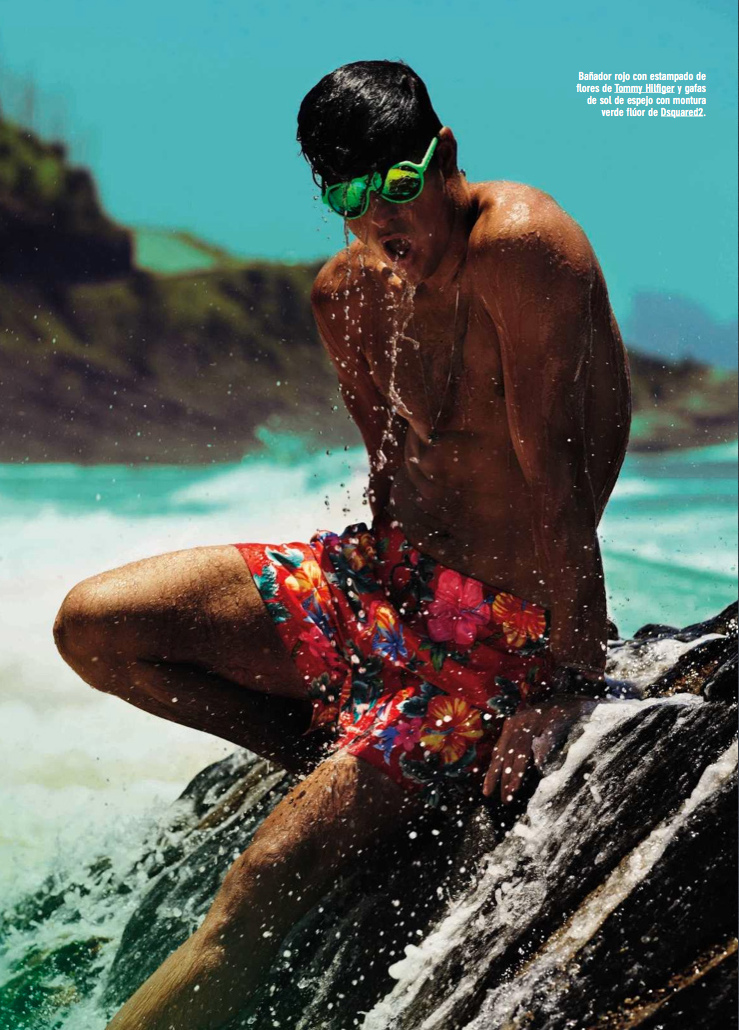 Body in Motion–Photographer Giampaolo Sgura and fashion editor Miguel Arnau reunite with model Evandro Soldati to shoot a dynamic story published in the June issue of Spanish GQ. Focusing the attention on summer’s most desirable beachwear styles, Sgura photographs the Brazilian model in a series of saturated images, where the colors of the sea and the nature create the perfect background for the designs selected by Arnau for the editorial. From bold neon colors, to exotic floral prints, Evandro is the perfect surfer, embracing an active lifestyle on the beach, but without forgetting to protect his head and eyes from the damages of sun, thanks to fashionable caps and mirrored sunglasses. / Photography assistance by Angela Imptora and Filippo Tarentini. Styling assistance by Leonardo Neves. Grooming by Andrew Guida (CloseUp Milano). Makeup by Jessica Nedza (CloseUp Milano).