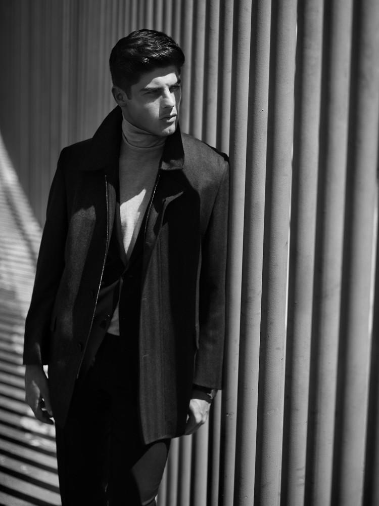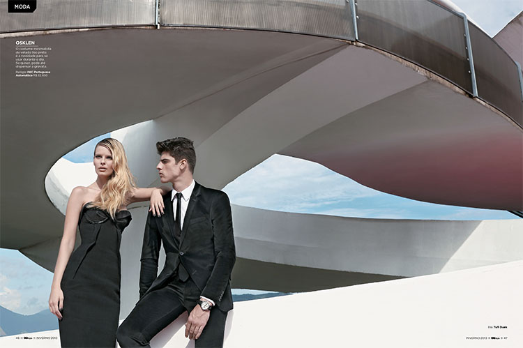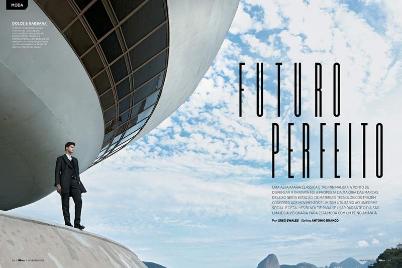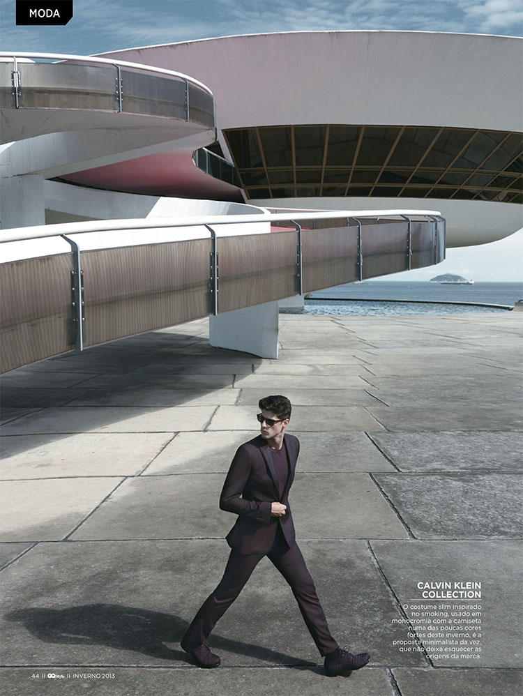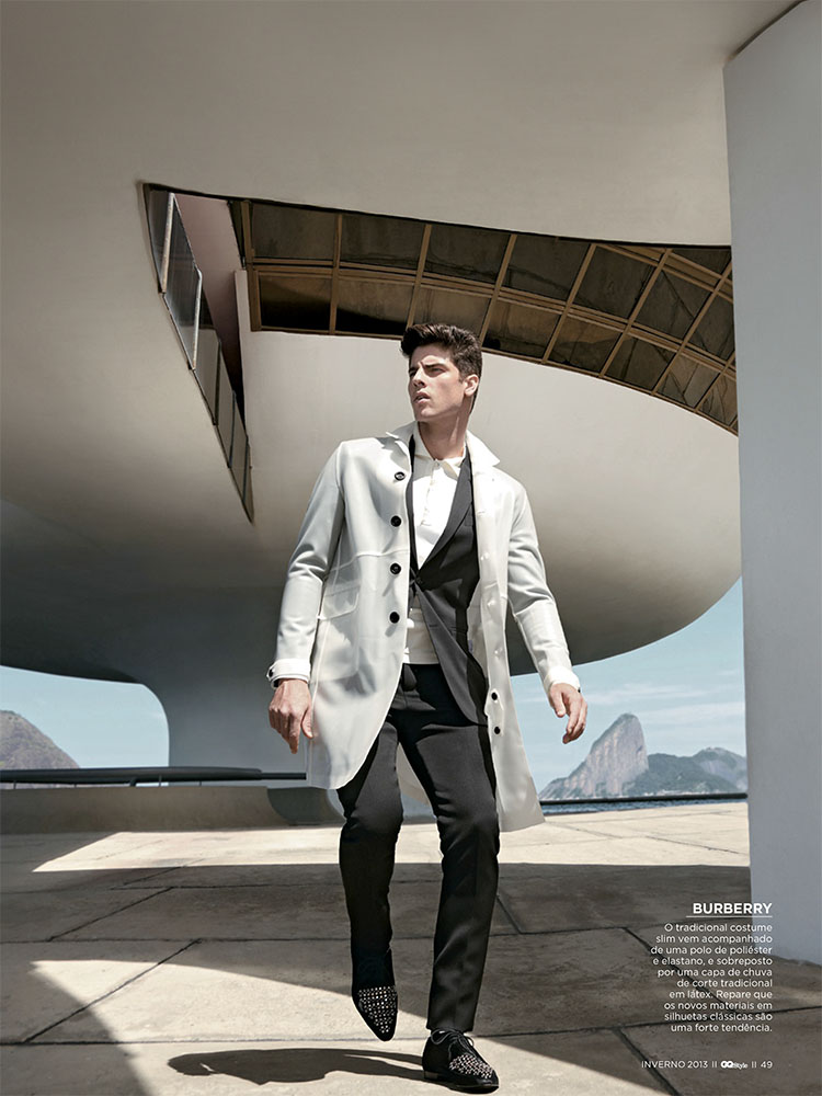 Forward-Facing–Decked out in a wardrobe that combines minimal and classic lines, but revisited in a more contemporary way with the use of innovative fabrics and cuts, Brazilian model Evandro Soldati appears before the lens of Greg Swales for this story published in the July issue of Brazilian GQ. Captured in a modern and architectural setting, Evandro is styled by Antonio Branco in brands such as Giorgio Armani, Dolce & Gabbana and Burberry, defining sleek silhouettes, where black, the non color par excellence, and symbol of elegance, is paired with rich browns, optical white or aubergine nuances.