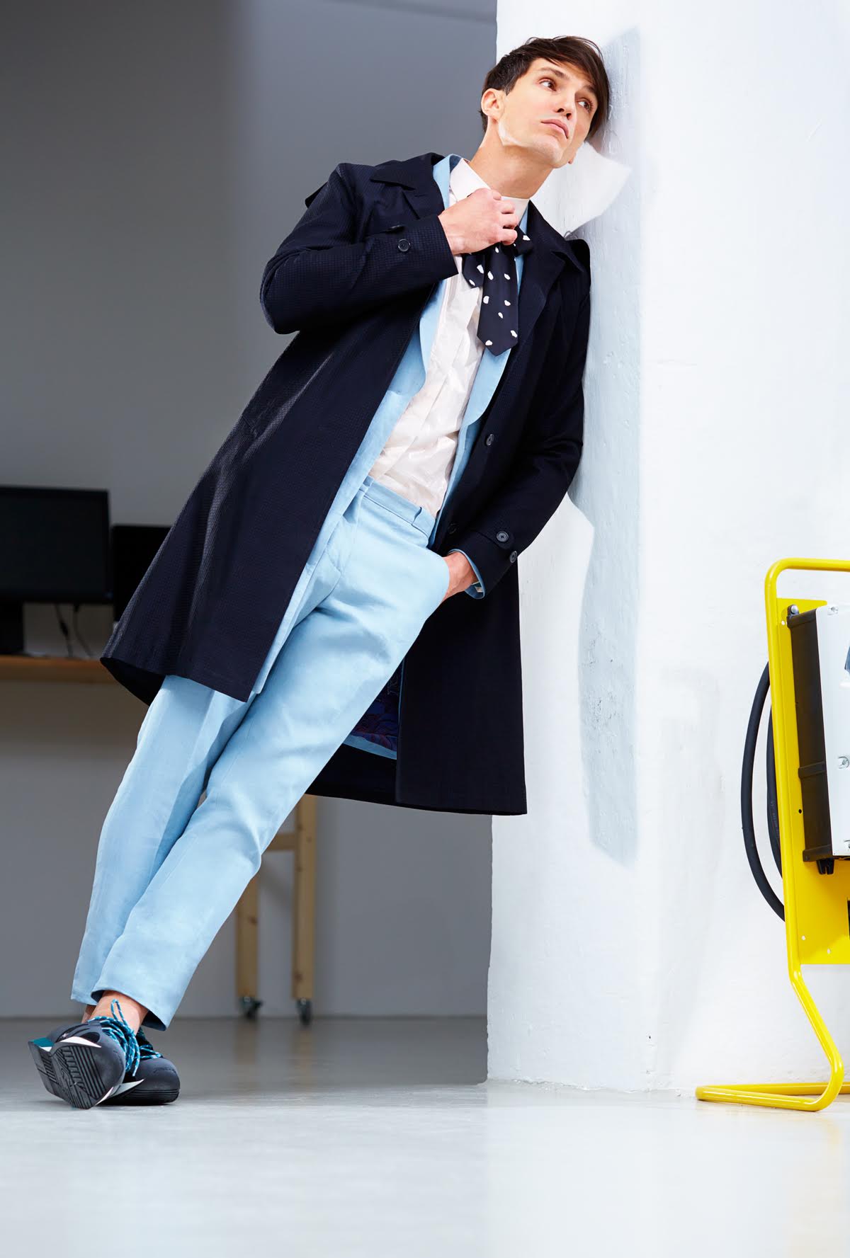 PinDylan wears shirt Jil Sander, trench coat Calvin Klein and tie Hugo Boss.