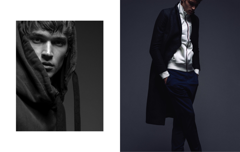 Left: Jonas wears hooded sweatshirt Rituals. Right: Jonas wears track jacket Tommy Hilfiger, trousers COS, and coat Whyred.Pin