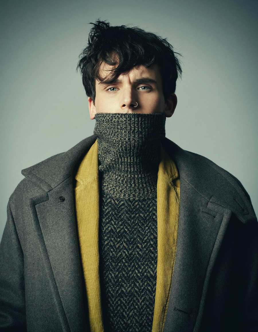 Dynamic designer fashions are cast in the spotlight for an editorial from photographer Sam Bisso and stylist Christian Schiebold. Long tailored coats, patterned knitwear and leather outerwear are brought together for the shoot featuring Julian Reik. The Kult model brings a modern attitude to the story, donning a nose ring as he showcases fashions from brands such as Raf Simons, Givenchy and Salvatore Ferragamo. / Grooming by Anja Fichtenmayer.