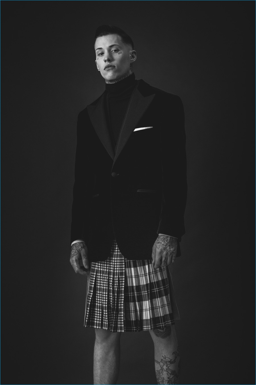 PinRyan wears turtleneck sweater Hardy Amies, pocket square Jaeger, waistcoat and tuxedo jacket Stephen Williams.PinRyan wears waistcoat Stephen Williams, turtleneck sweater Hardy Amies and trousers Prada.PinRyan wears blazer Prada, pocket square Gieves & Hawkes, shirt and tie Ralph Lauren Purple Label.PinRyan wears leather biker jacket his own and scarf Alexander McQueen.PinRyan wears turtleneck sweater Hardy Amies, pocket square Jaeger, kilt LeKilt, waistcoat and tuxedo jacket Stephen Williams.PinRyan wears suit Stephen Williams and pocket square Gieves & Hawkes.PinRyan wears suit Prada, pocket square Gieves & Hawkes, ring The Great Frog, shirt and tie Ralph Lauren Purple Label.PinRyan wears chain his own.