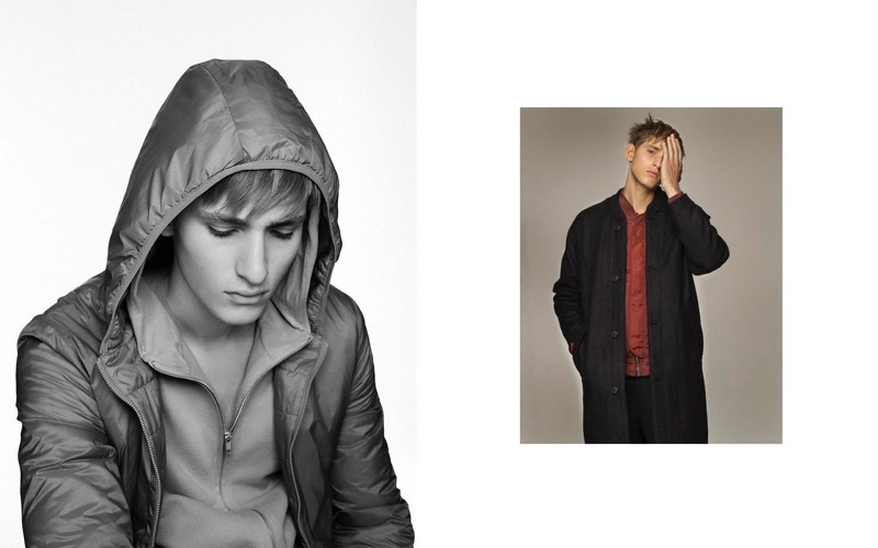 Left: Yanniek wears hooded jacket and full-zip sweatshirt American Vintage. Right: Yanniek wears bomber jacket and long coat H&M.Pin