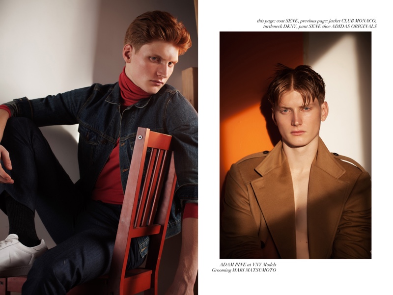 PinLeft: Adam wears turtleneck DKNY. Right: Adam wears jacket DKNY, sweater Cadet, shoes Adidas Originals, pants and coat Sene.PinLeft: Adam wears jacket Cadet, top Club Monaco, pants Sene, scarf DKNY, and shoes Adidas Originals. Right: Adam wears turtleneck DKNY, coat and pants Sene.PinLeft: Adam wears jacket Club Monaco, turtleneck DKNY, pants Sene, and shoes Adidas Originals. Right: Adam wears coat Sene.