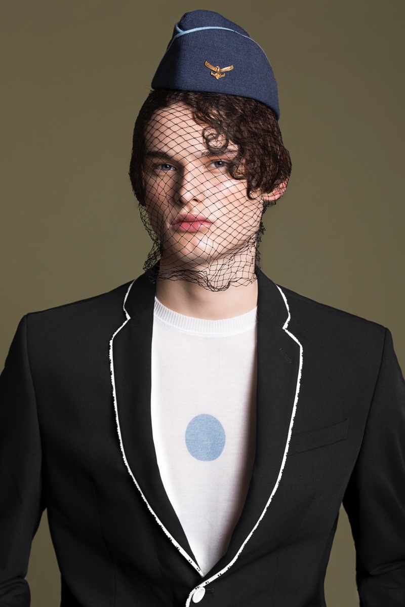 Tuur wears blazer Alessandro Dell’Acqua, t-shirt Obvious Basic, vintage military cap A.N.G.E.L.O., and veil Archivio Guerrini.