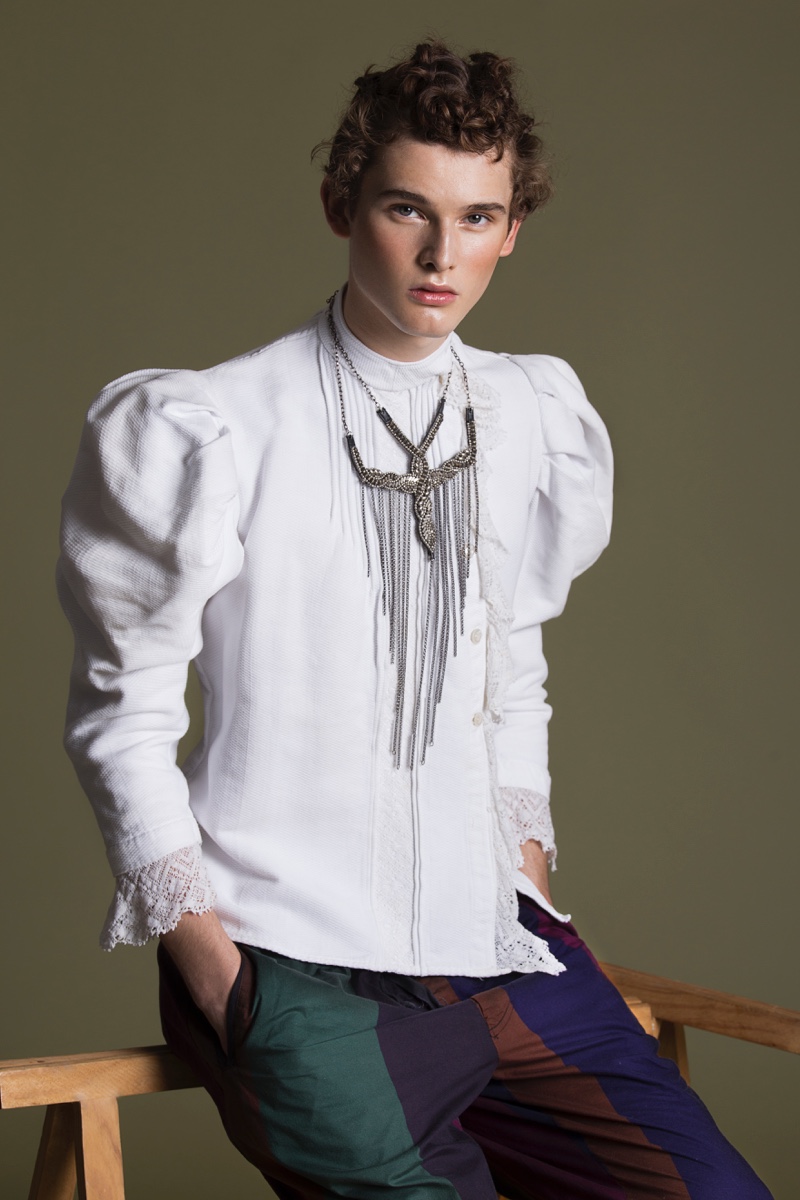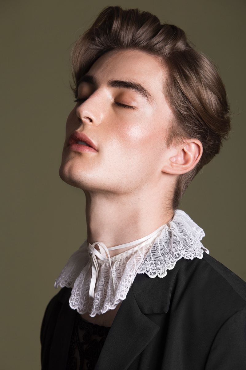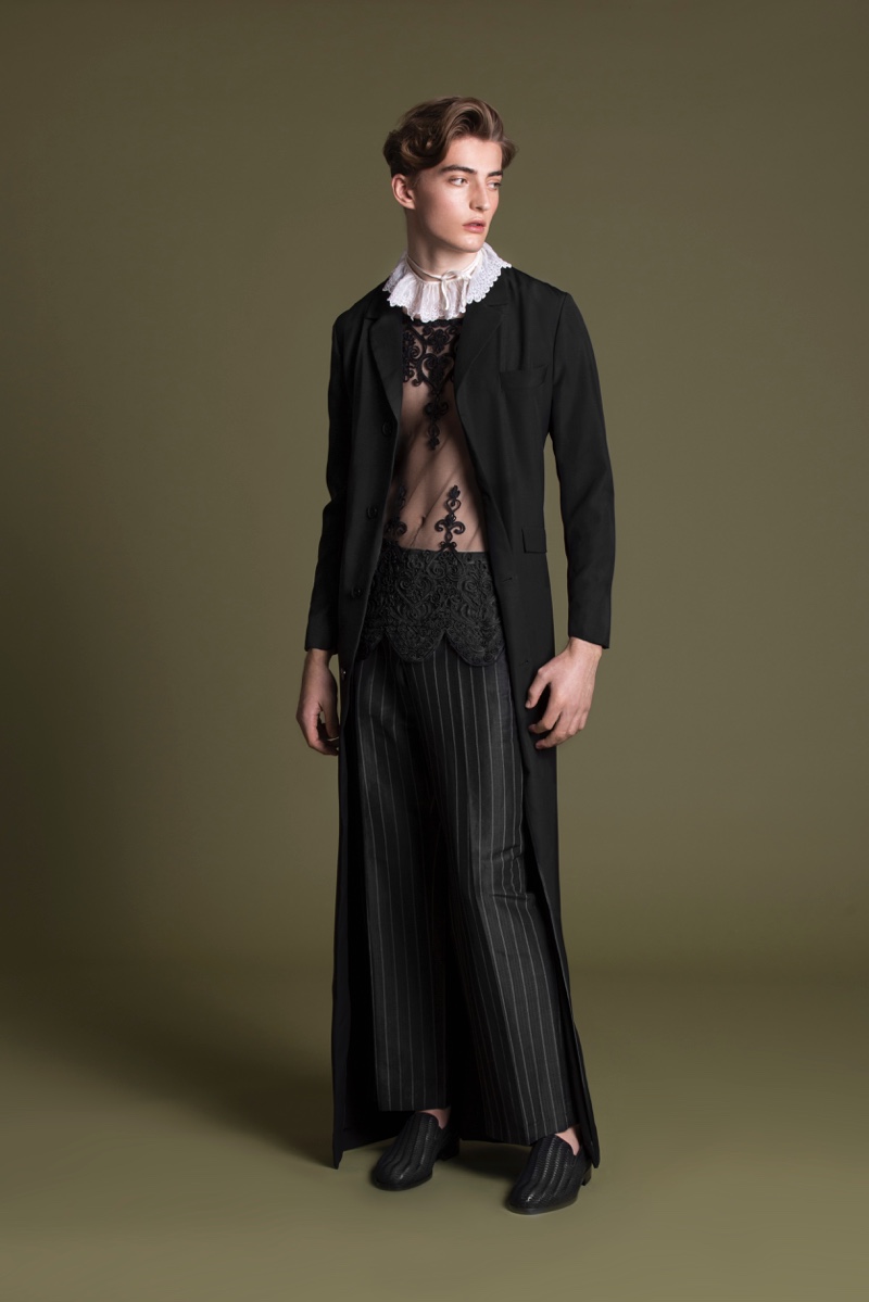 Angus wears coat Edithmarcel, lace tank Yezael by Angelo Cruciani, and vintage lace collar A.N.G.E.L.O.