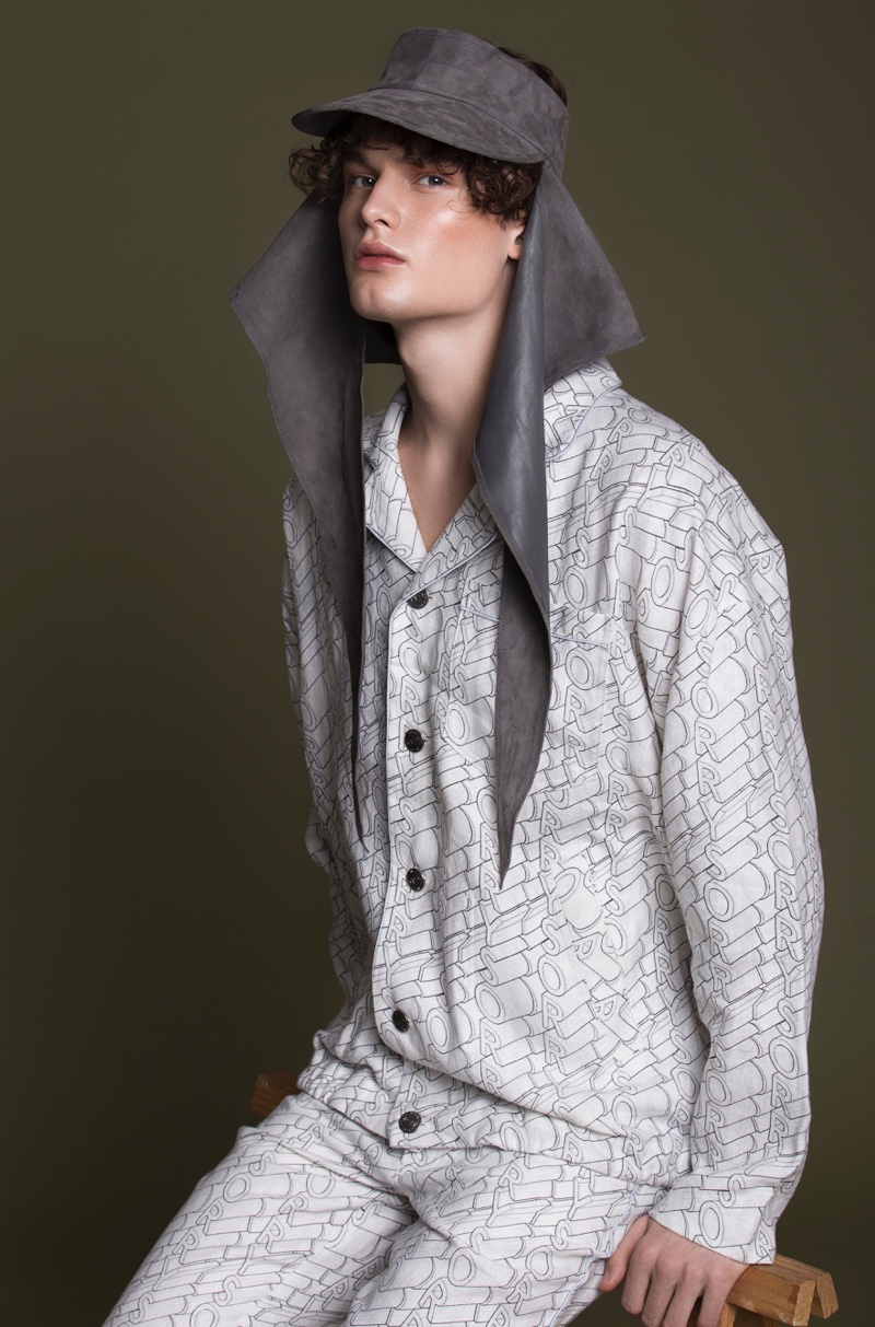Tuur wears all clothes Julian Zigerli and suede visor Nicholas K.