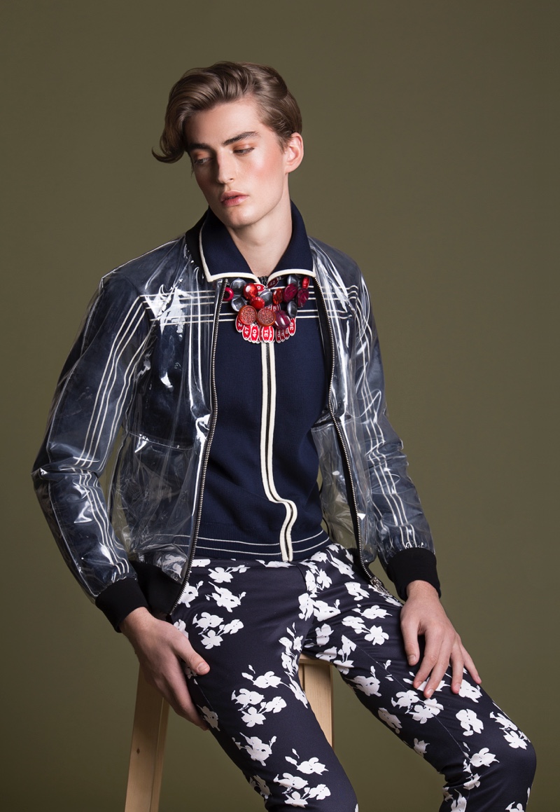 Angus wears plastic jacket Urban Les Hommes, full-zip jacket Andrea Pompilio, trousers Department 5, and necklace Dolores Bacchi & Simonetta Martini Bijoux.