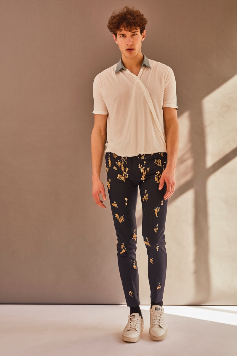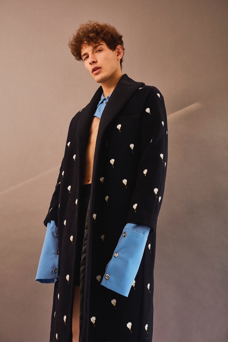 PinPetar wears a vintage coat with a Misbhv t-shirt.PinPetar wears shirt COS, shoes G-Star, embellished bomber jacket and striped pants Ana Locking.PinPetar wears sweater Brooks Brothers, shirt and pants Raúl Rodríguez Menswear.