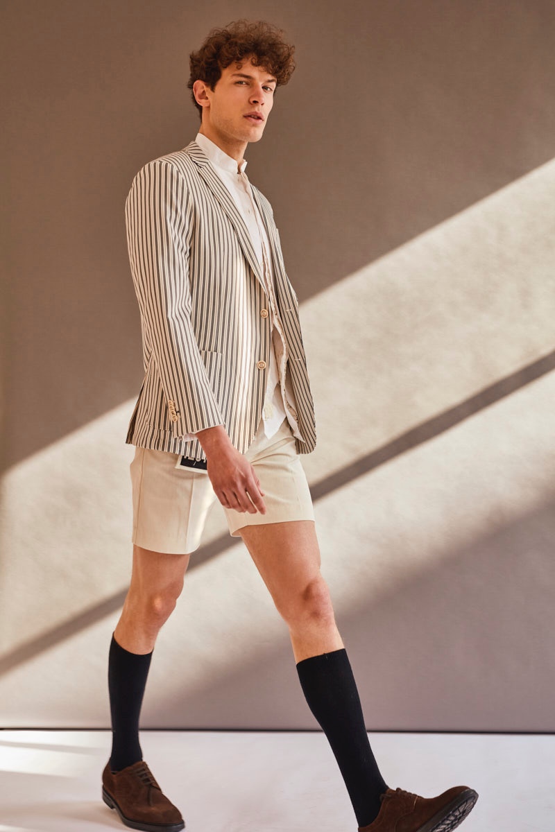 PinPetar wears shirt and shorts Nouman.PinPetar wears striped jacket Macson and shirt Raúl Rodriguez Menswear.