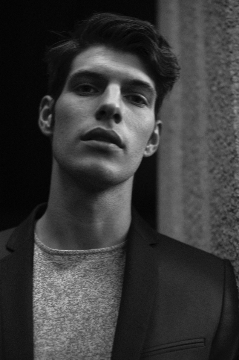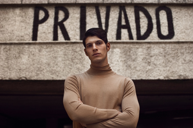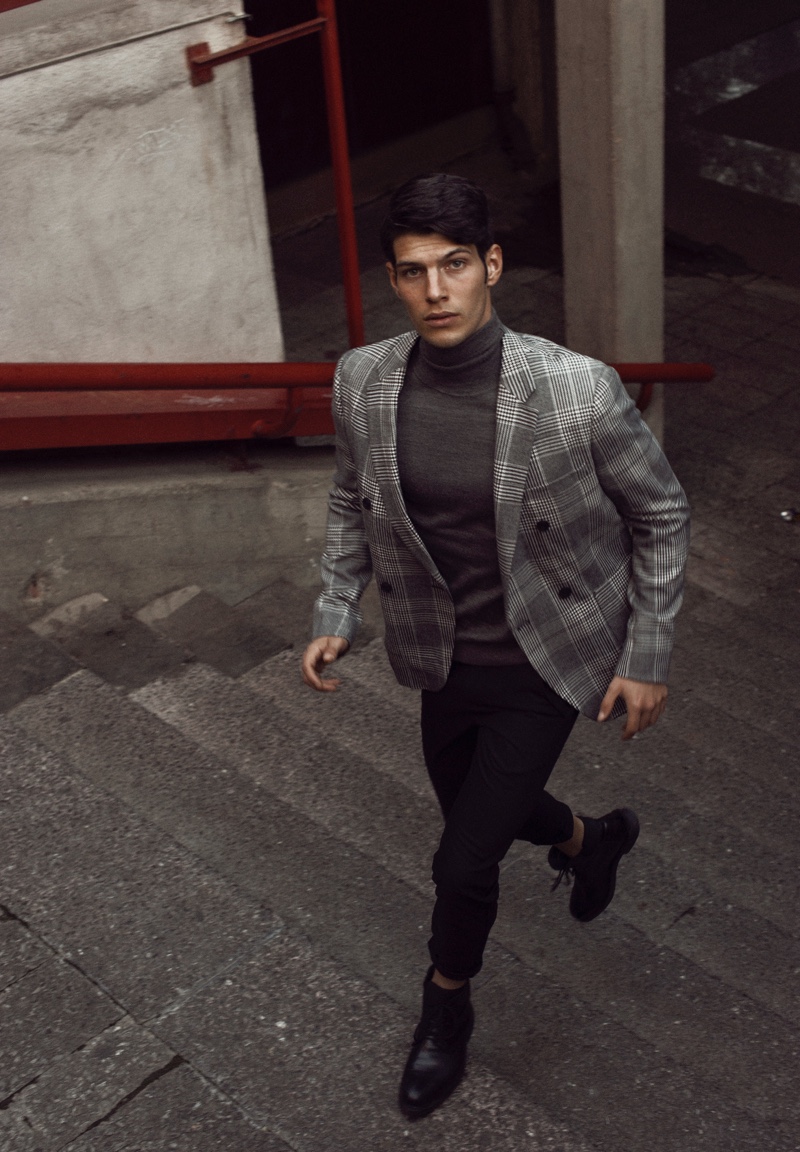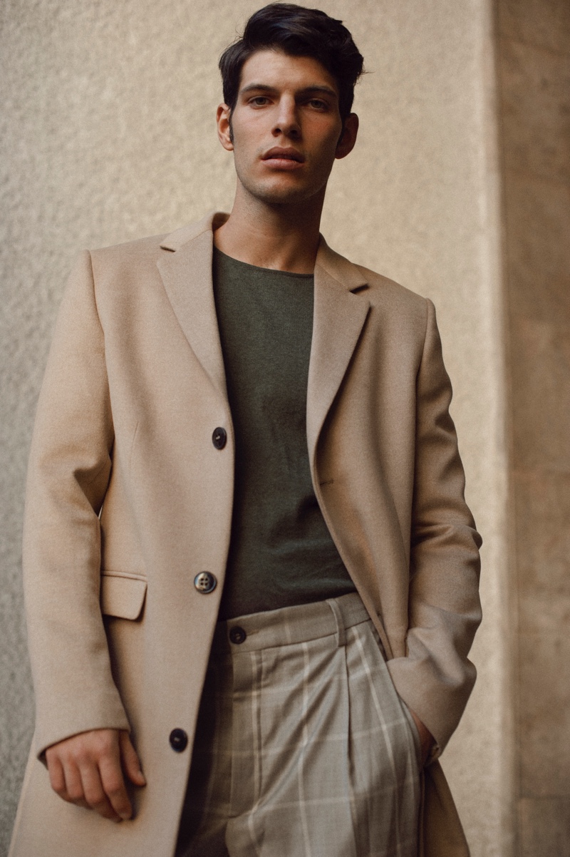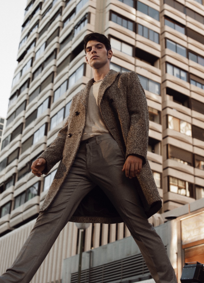 Víctor Lorente steps out in Madrid, Spain for a new exclusive by photographer Aarón LB. The Sight Management model embraces current fashions with a clean tailored wardrobe. Stylist Ángela Isla outfits Víctor in single-breasted coats and jackets with trim trousers. Víctor’s ensembles include brands such as Zara, Ralph Lauren, and Mango Man.
