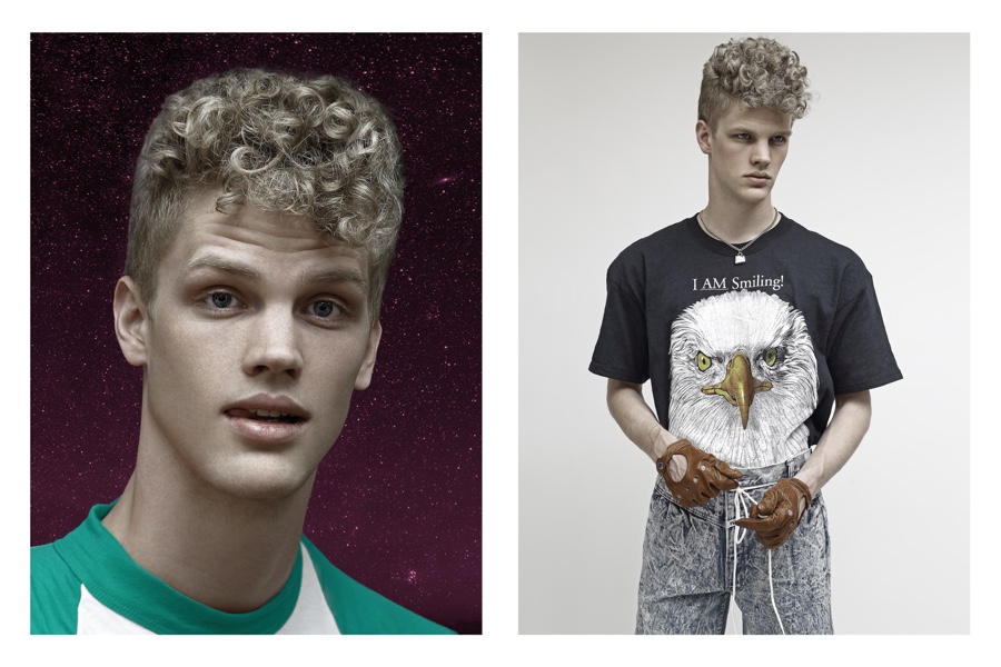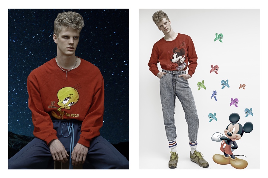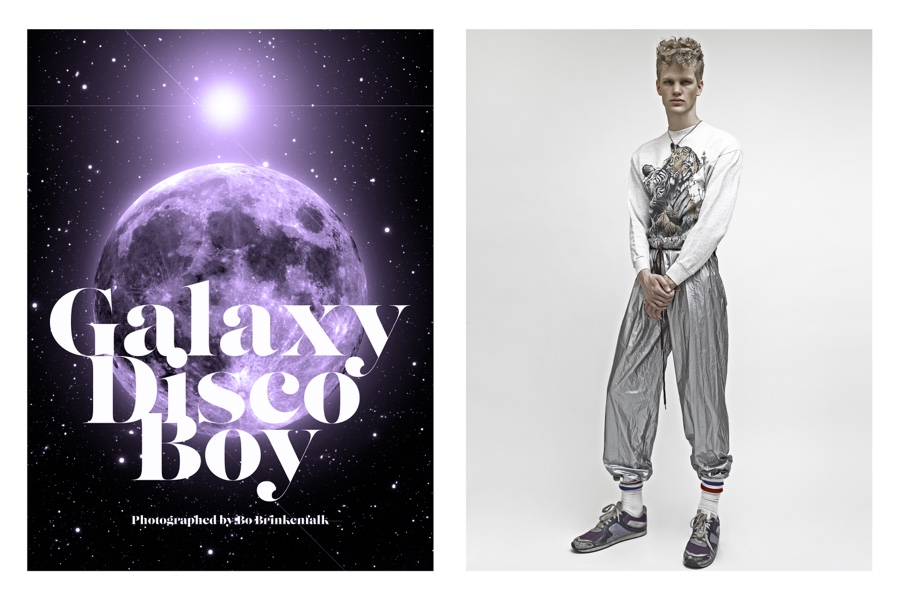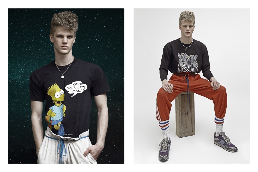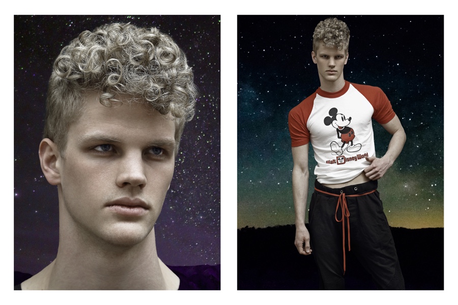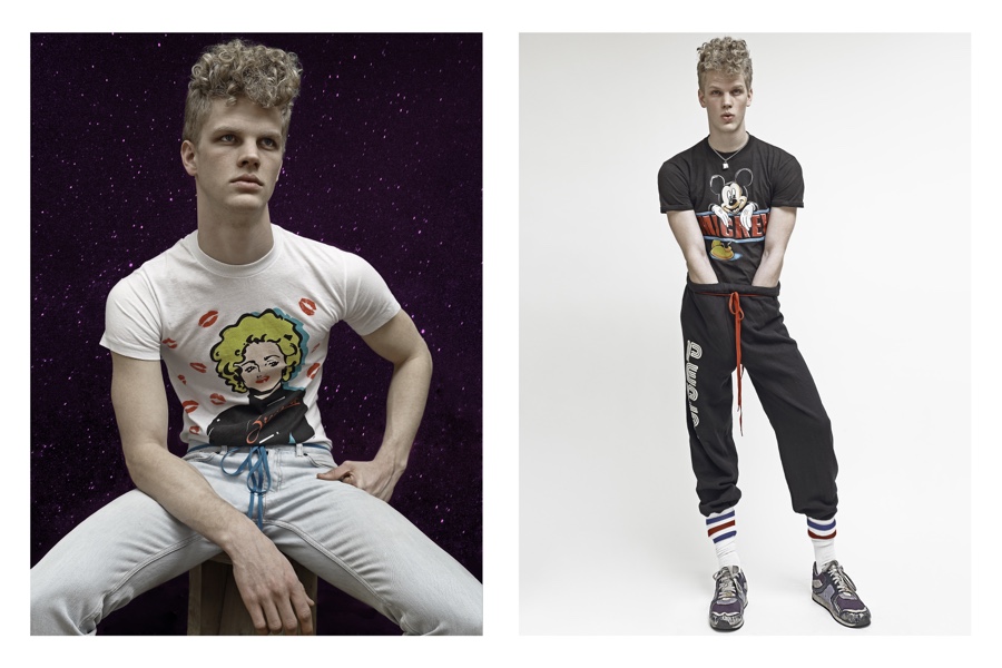Fashion photographer Bo Brinkenfalk reexamines his creative wheelhouse and pulls out a throwback of a story featuring Benjamin (Modellink). Embracing a cheeky attitude, images of Benjamin are juxtaposed with galaxy themed art. Wearing a wardrobe from Beyond Retro, Benjamin’s retro day delivers glimpses at several of our favorite childhood icons such as Mickey Mouse and Bart Simpson.