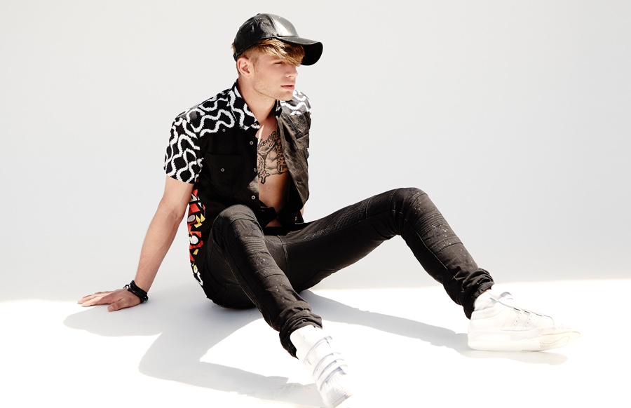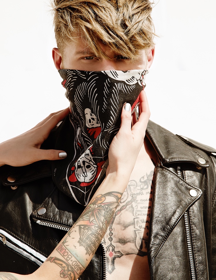 PinCody wears quilt sweatshirt Helmut Lang, black jeans Diesel and leather jacket BLK DNM.PinCody wears t-shirt Diesel, cargo pants Dsquared2 and striped zip jacket AMI.PinCody wears denim jacket AMI and slim-cut jeans M3.PinCody wears denim jacket AMI and slim-cut jeans M3.PinCody wears white beanie Brian Lichtenberg.PinCody wears jumpsuit Chapter and sandals Raf Simons for Adidas.PinCody wears striped shirt AMI, black denim jeans Diesel and loafers Viktor & Rolf.PinCody wears black denim jeans Diesel and vintage bandana stylist’s own.PinCody wears hand-painted leather biker jacket and vintage bandana stylist’s own.PinCody wears underwear Calvin Klein, hand-painted leather biker jacket and vintage bandana stylist’s own.