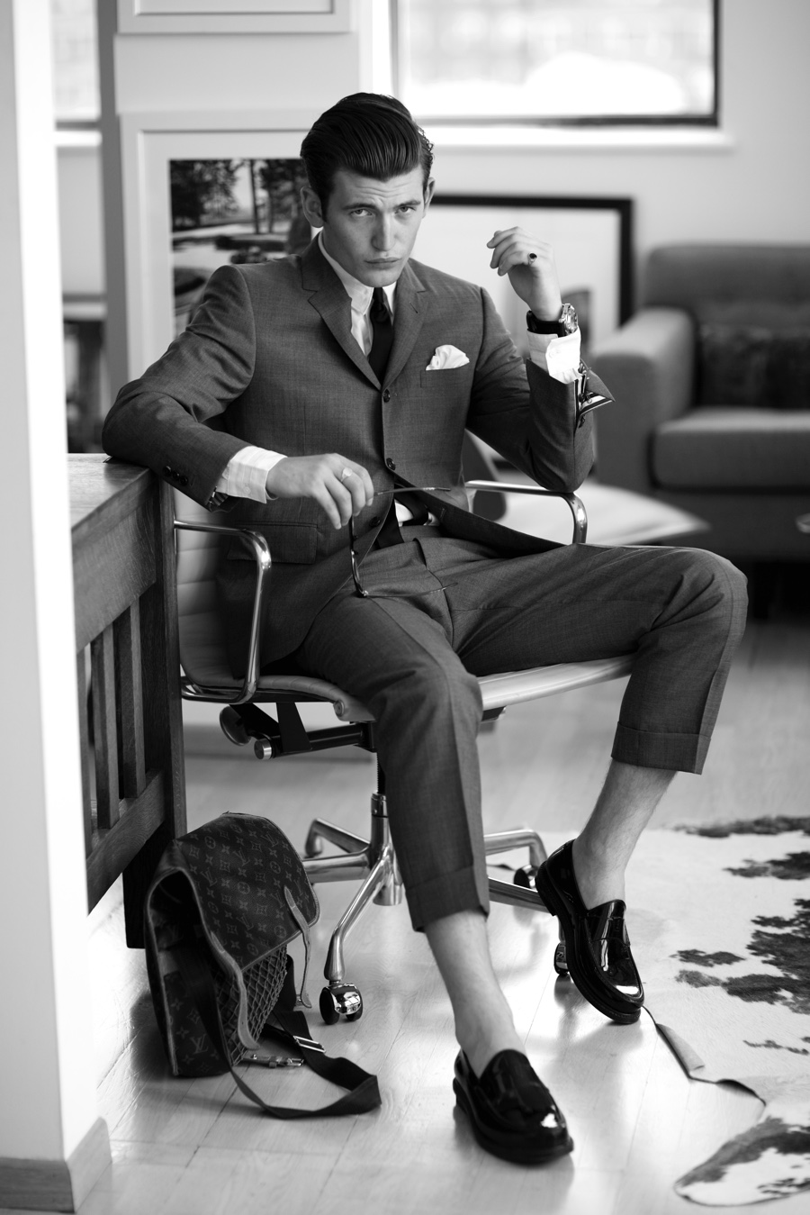 Dylan wears suit Thom Browne for Black Fleece, tie Dior Homme, shoes Saint Laurent, watch Panerai, messenger bag Louis Vuitton and shirt Public School.